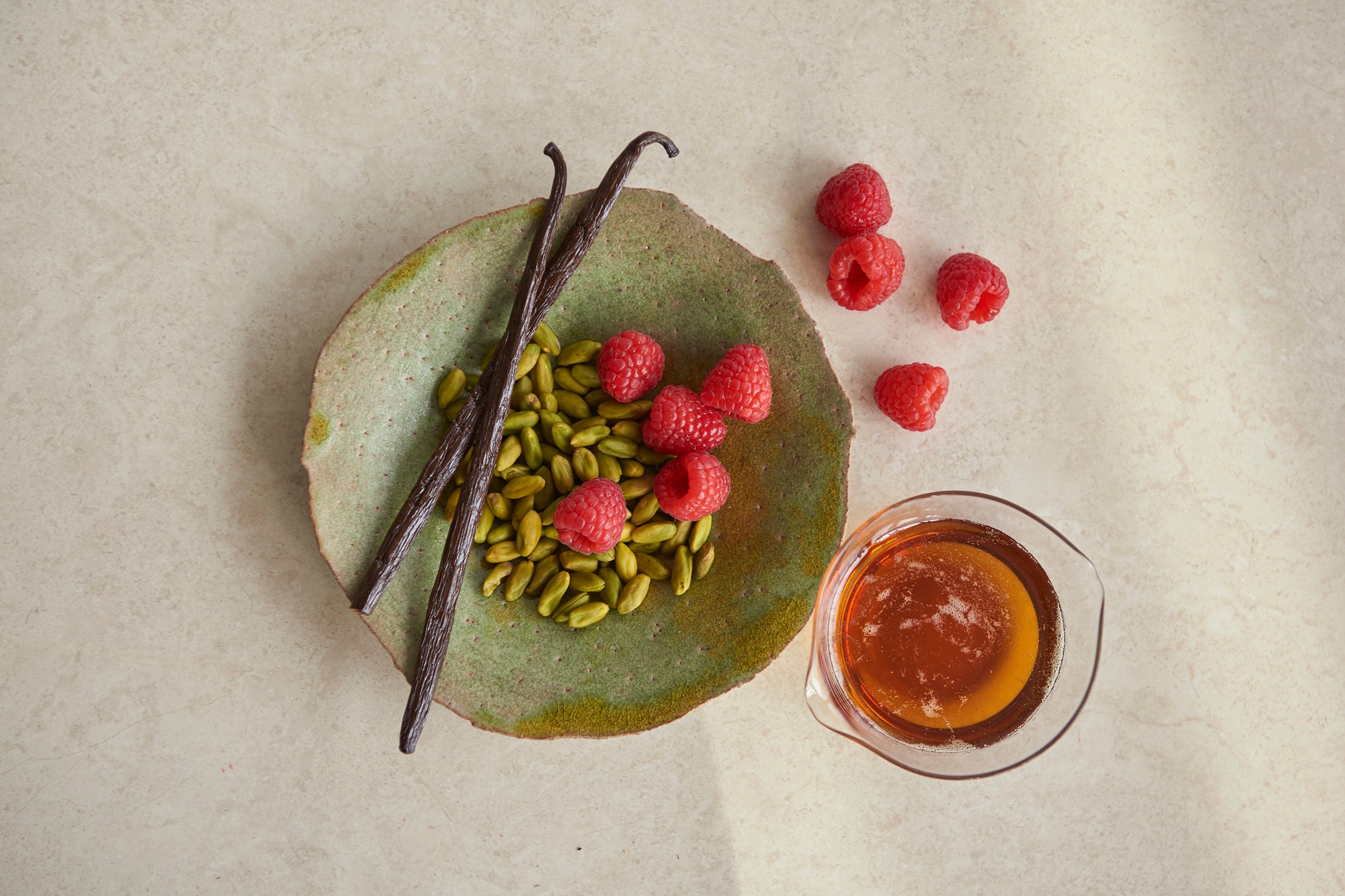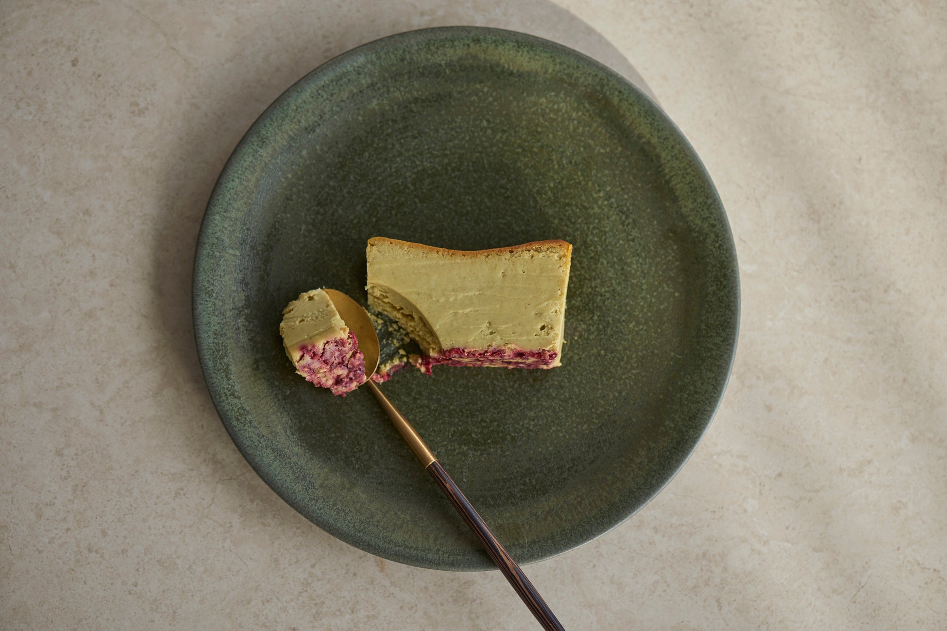 濃厚なローストピスタチオの味わいをお楽しみいただけるホリデー限定フレーバー。火香という甘く香ばしい風味を強めた抹茶やバニラ、メープルシロップなどを合わせることで、香ばしさや旨味を強調しました。ケーキの底に忍ばせたラズベリーの爽やかな酸味は、ピスタチオの濃厚な味わいを引き立てます。