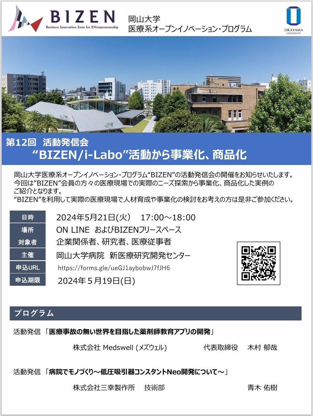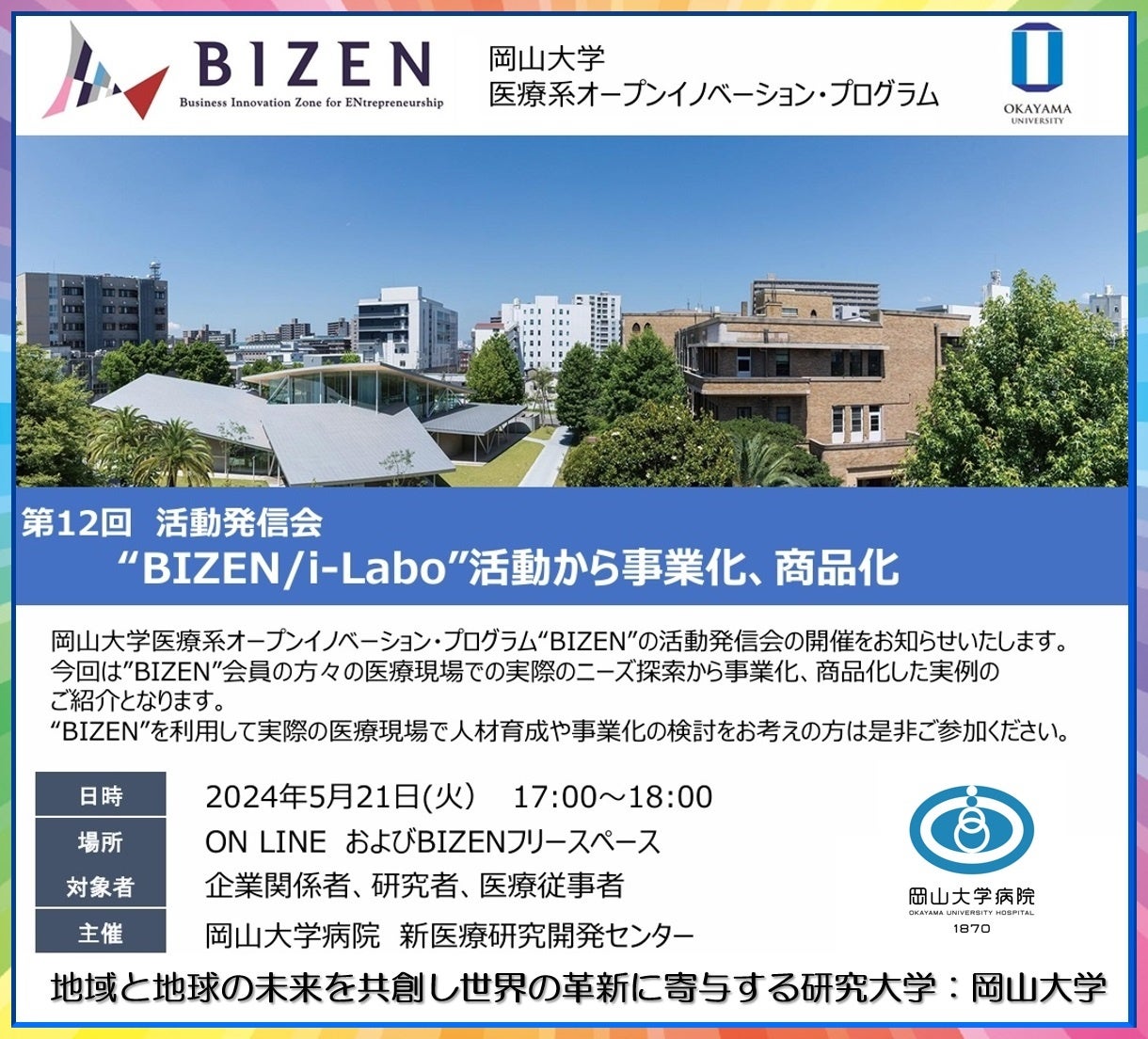 【岡山大学】第12回BIZEN活動発信会 「“BIZEN / i-Labo”活動から事業化、商品化」〔5/21,火 ハイブリッド開催〕