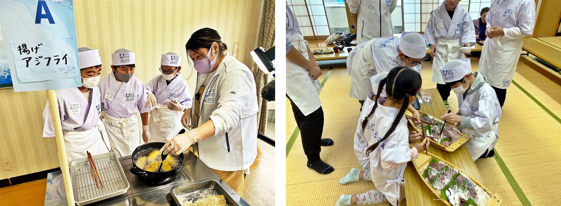 魚さばきでは、基本の「アジ」と、重茂漁業協同組合から届いた「ショッコ※」の三枚おろしに挑戦。(有)魚広の廣田諭宇祐先生が魚さばきのお手本を見せると、子どもたちは自ら包丁を握り、真剣に魚さばきに取り組みました。さばいたショッコの胃から小さなイカが出てきて驚きの声を上げる子や、はじめて丸ごとの魚を触った!とそれぞれ魚と向き合う様子がみられました。魚さばきを体験した子どもたちからは「2種類の魚をさばいて楽しかった」「自分がさばいた魚で家族に料理を振る舞いたい」「お父さんが釣ってきた魚を家でさばきたい」「寿司職人になりたい」といった声があがりました。