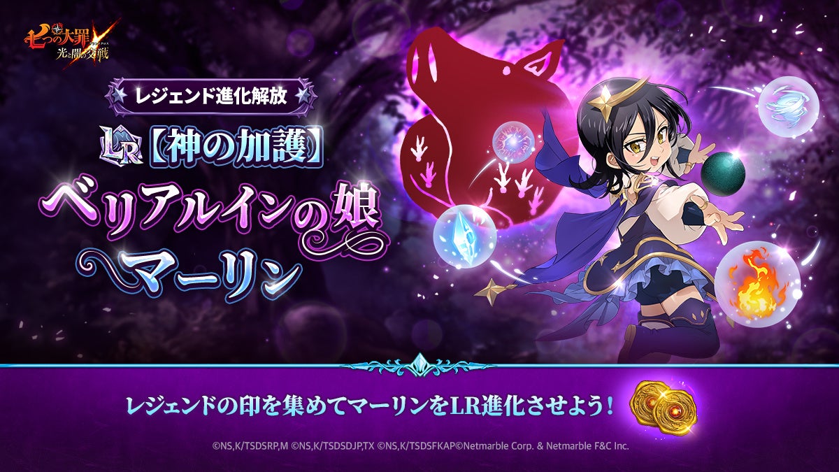 本アップデートより、【神の加護】ベリアルインの娘 マーリンのLR進化が解放いたしました!各種コンテンツでレジェンドの印を集めてLRに進化させよう!