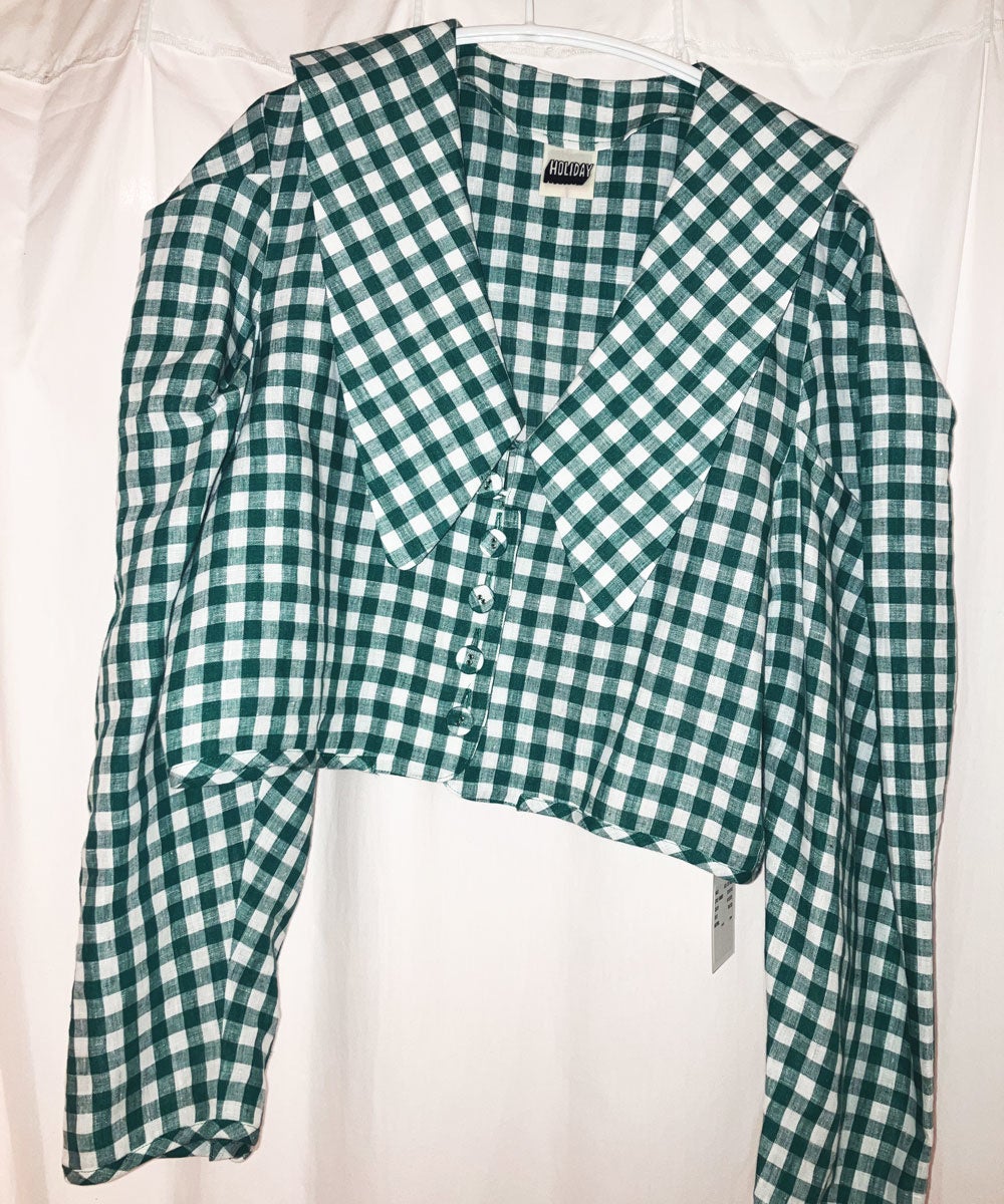 60番手先染めフレンチリネンを使用し、ドライな質感と程よい厚みで着心地良く過ごせる、ギンガムチェックの長袖セーラーカラーシャツ。ボリュームのあるパフショルダーがポイントで、丈が短めですっきり着こなしやすい一着です。別売りで展開している同デザインのギンガムチェックのロングスカートと合わせて、セットアップでの着用も可能。スカード以外にもパンツともコーディネートしやすいアイテムです。