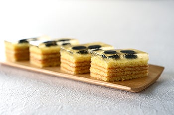 国産有機大豆の炒り豆や金かすてらなど、金沢土産として人気の和洋菓子を販売する「まめや金澤萬久」。和と洋の人気菓子2つを合わせた「わらび餅のバウム」は、国産黒豆の甘納豆が入ったもちもちのわらび餅と、口どけのよいバウムクーヘンを重ねて仕上げています。それぞれの風味や食感が驚くほどの一体感で、見た目にも美しい逸品。黒豆以外に期間限定の味も。