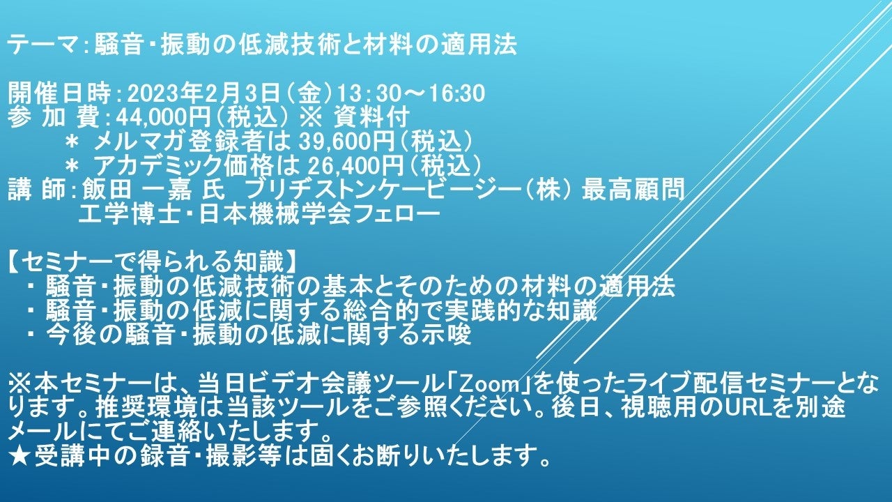 先端技術情報や市場情報を提供している(株)シーエムシー・リサーチ(千代田区神田錦町: https://cmcre.com/ )では、 各種材料・化学品などの市場動向・技術動向のセミナーや書籍発行を行っておりますが、 このたび「騒音・振動の低減技術と材料の適用法」と題するセミナーを、 講師に飯田 一嘉 氏 ブリヂストンケービージー(株) 最高顧問 工学博士・日本機械学会フェロー)をお迎えし、2022年2月3日(金)13:30より、 ZOOMを利用したライブ配信で開催いたします。 受講料は、 一般:44,000円(税込)、 弊社メルマガ会員:39,600円(税込)、 アカデミック価格は26,400円(税込)となっております(資料付)。