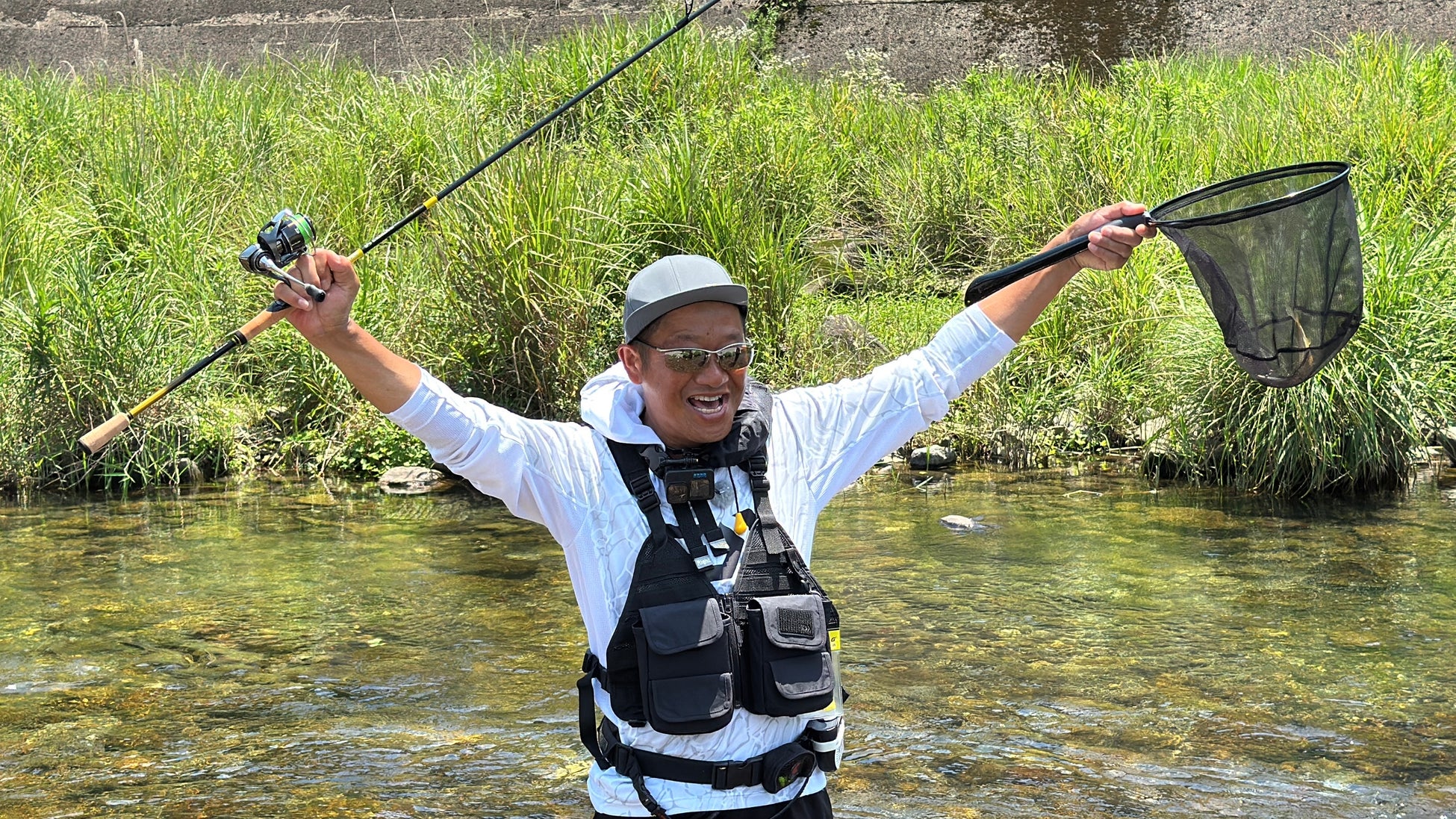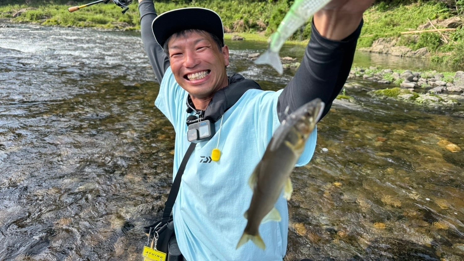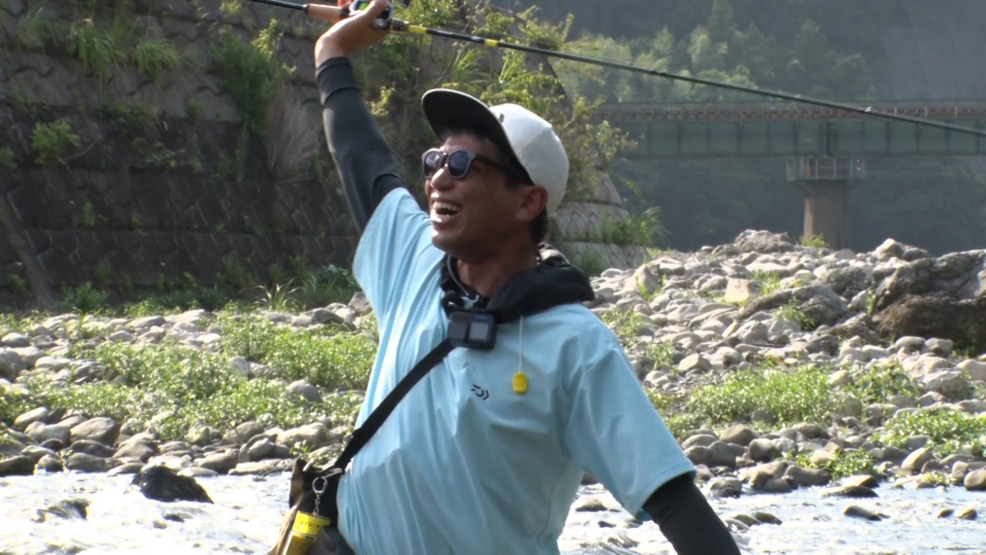すると有岡のルアーの横からアユが飛び出してきた。ヒット! 見事、手にしたのは夏の光に美しく輝くアユ。この出会いに有岡は「夏が来た!」と喜びを隠すことができない。