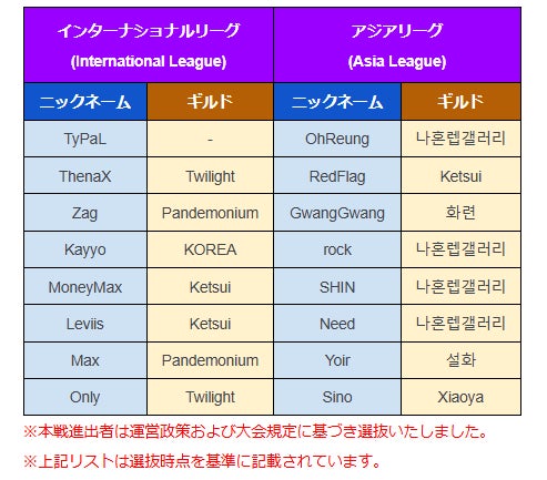 本大会の本戦には、アジア地域のプレイヤーを対象とした「アジアリーグ」と、アジア以外の地域のプレイヤーを対象とした「インターナショナルリーグ」の2つのリーグで開催された予選において、上位ランキングを記録した16名の選手が出場いたします。