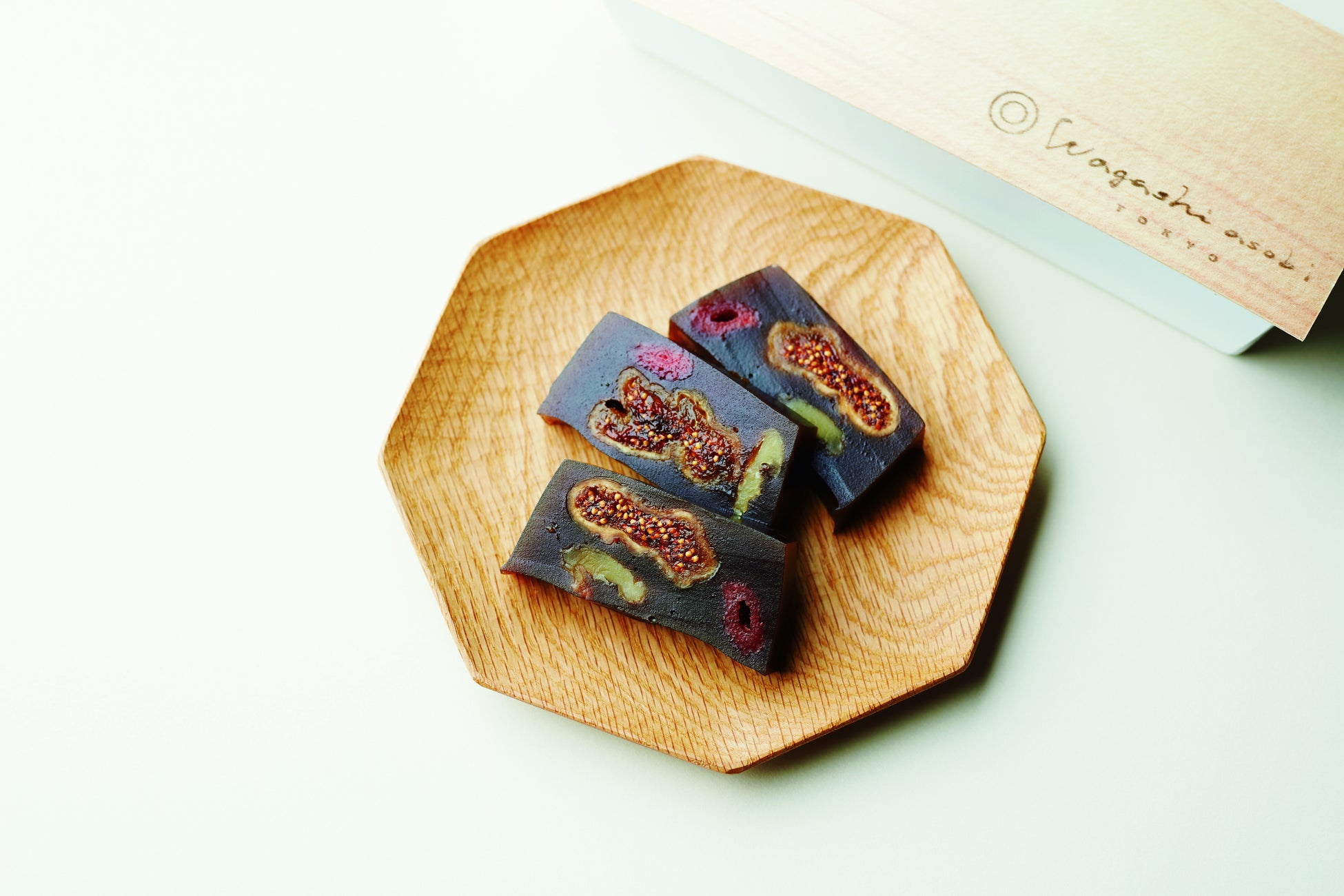 北海道産小豆の上質な餡と沖縄県西表産の黒糖とラム酒で炊き上げた、香り高くあっさりした甘さの羊羹に、ドライフルーツの苺と無花果、胡桃がゴロゴロと入っています。