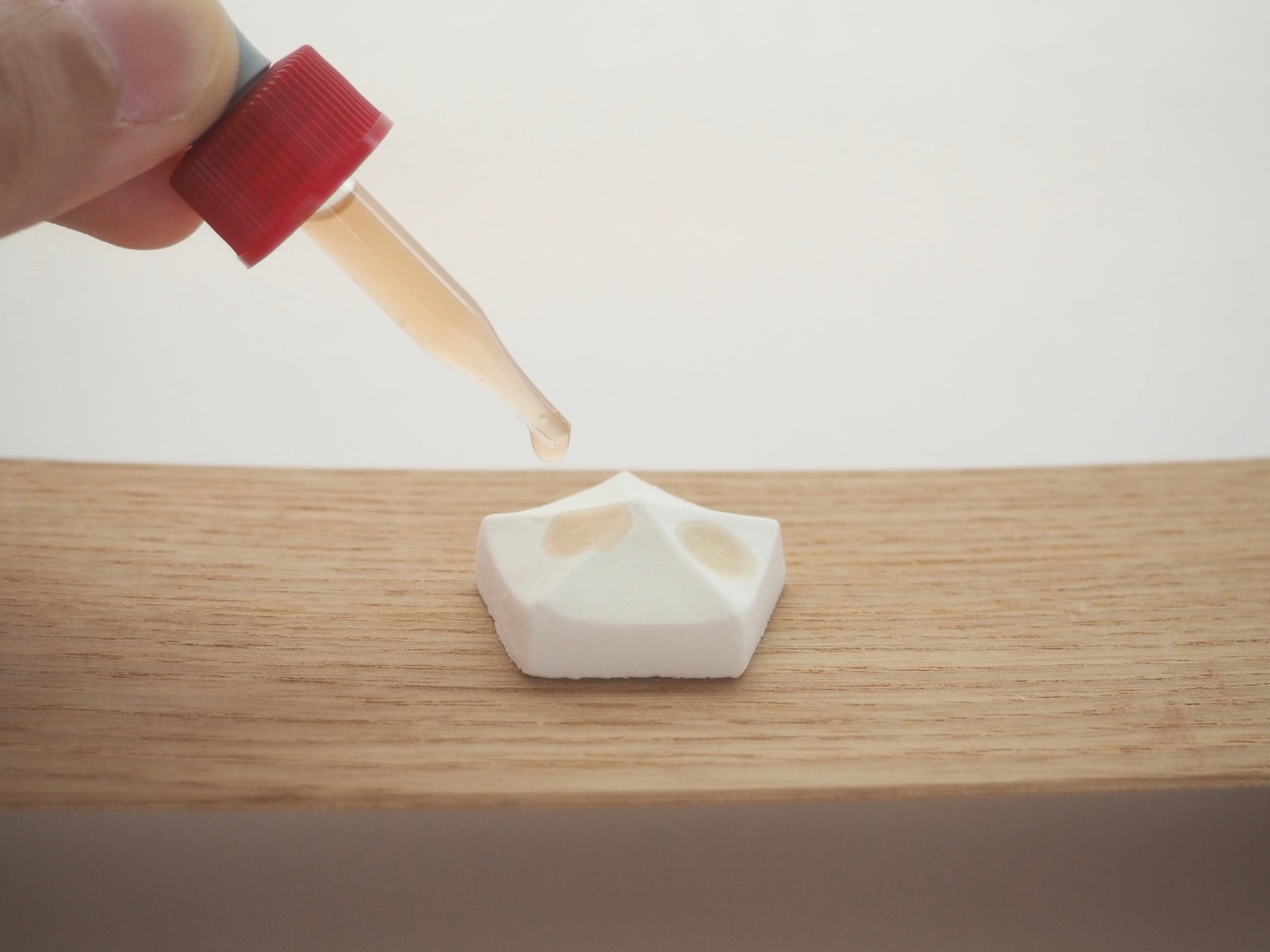 傘を模した落雁に生姜のシロップの雨粒を垂らします。地面にぽつっと落ちた雨粒がじんわりと滲みをつくるイメージが伝わってきます。