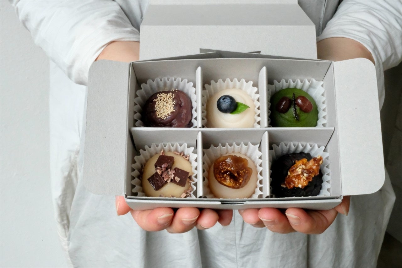 [小豆/けしの実]、[クリームチーズ餡/ブルーベリー]、[抹茶餡/大納言/塩昆布]、[ミルク餡/ショコラ/カカオニブ)]、[白みそ餡]、[黒ごま餡/胡桃キャラメリゼ]の6種の味をご用意。種皮はサクッとした食感を楽しんでいただくため、別包装でおわたしします。