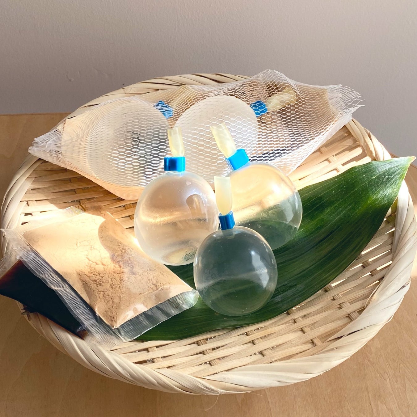 夏の人気商品「みずもち」。風船を割ると出てくる、まるで水玉の雫の様なぷるぷるの生菓子です。