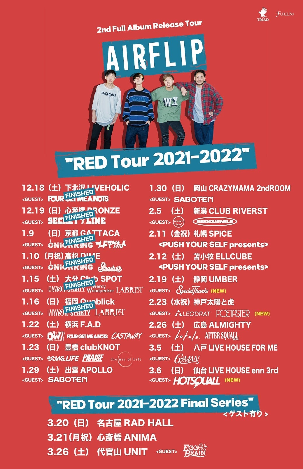 AIRFLIP「RED Tour 2021-2022」ゲストバンド第6弾 & ツアーファイナルゲストバンドも解禁