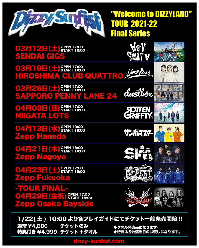 「Dizzy Sunfist “Welcome to DIZZYLAND” TOUR 2021-22 Final Series」では、通常チケット(チケットのみ)と特典付きチケット(チケット+タオル)の2種が、明日(1/22)午前10時より各プレイガイドにて一般発売開始される。