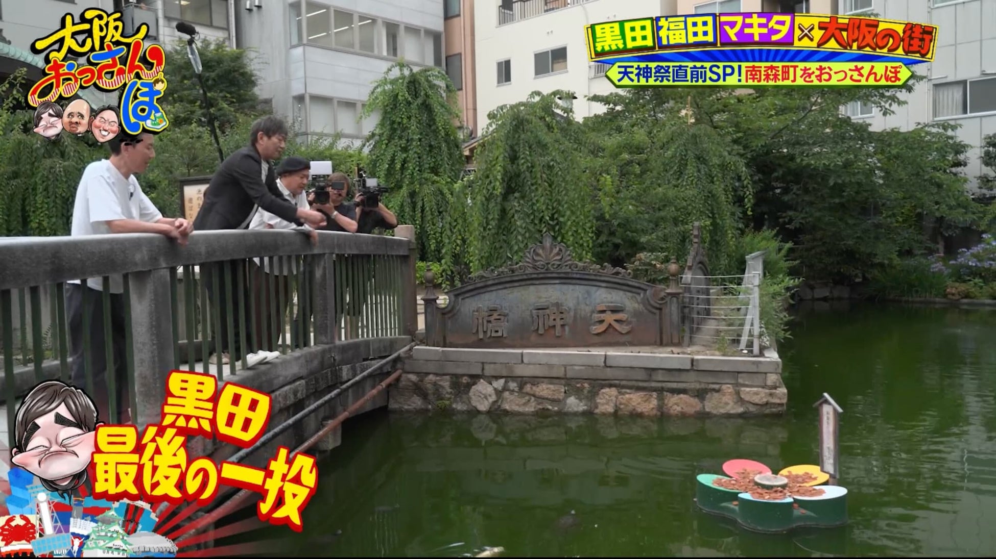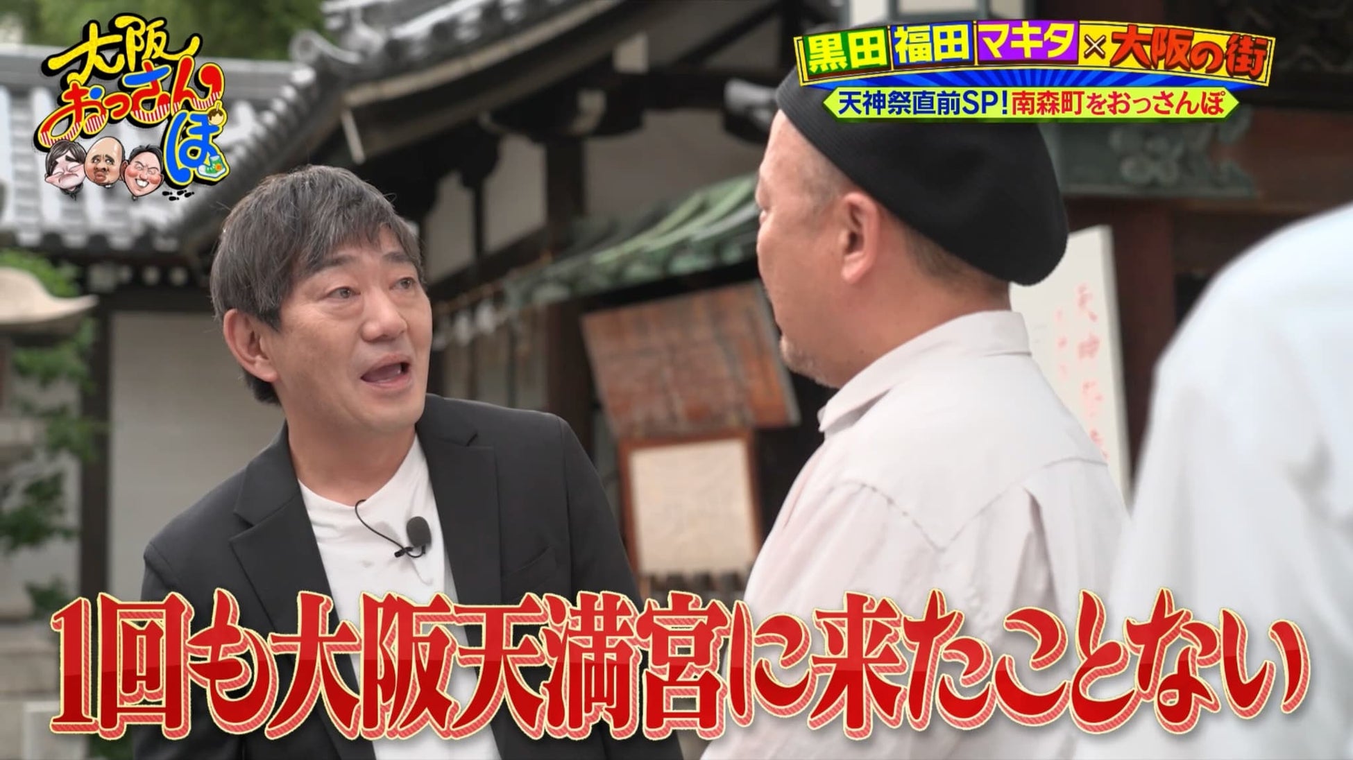 メッセ黒田とチュートリアル・福田充徳、そしてマキタスポーツという顔ぶれで、天神祭の舞台である「大阪天満宮」からスタート。昨年から『天神祭生中継』の司会を務める黒田だが、なんと「一回も大阪天満宮に来たことがない」そうで、まずおっさん3人で御本殿をおまいり。