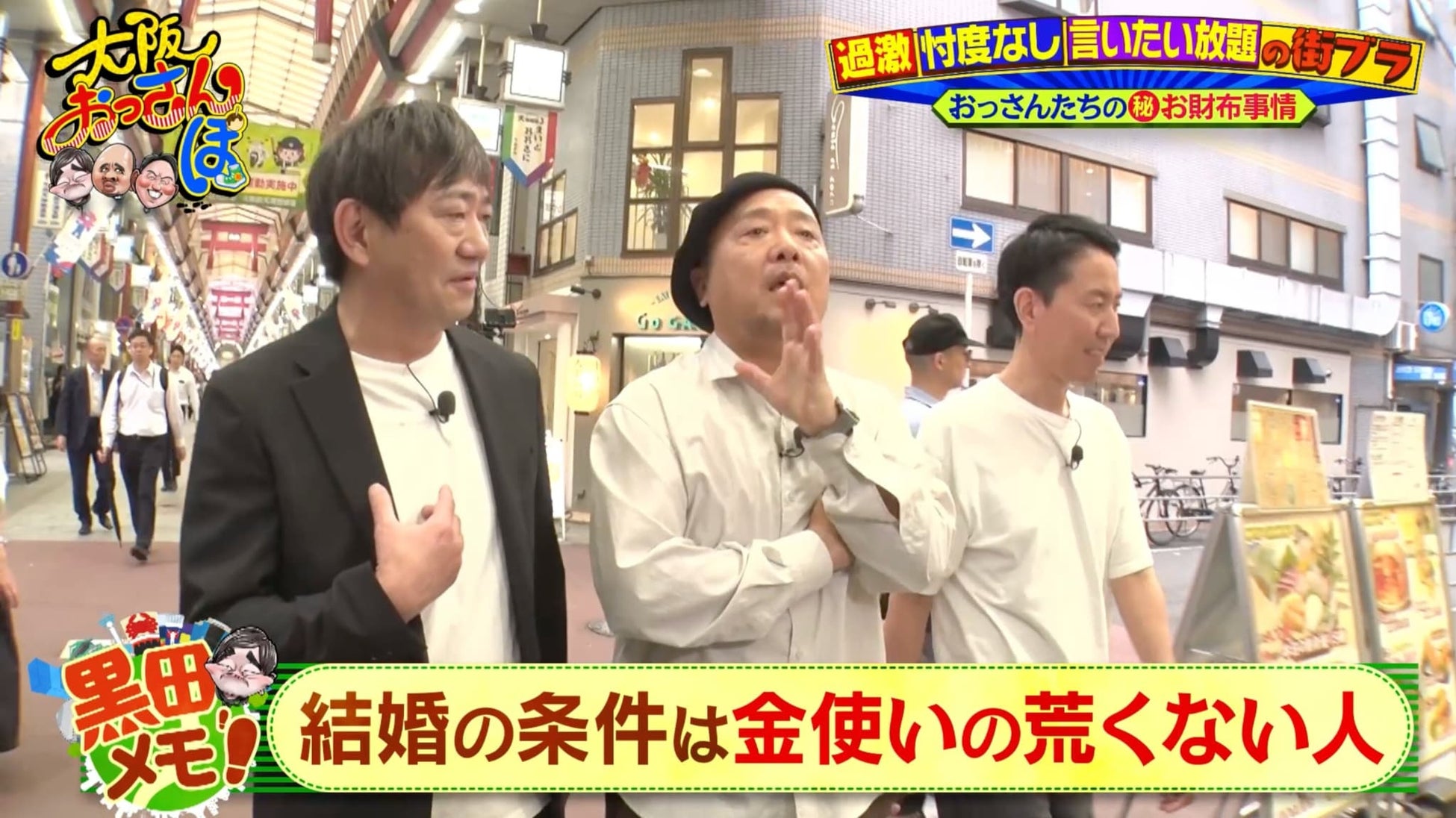 天神橋筋商店街をぶらり歩きながら、お金にまつわる話題も。黒田は結婚する女性の条件を「金遣いの荒くない人」と決めていたといい、奥様と出会った当初もブランド物好きかどうかを見極めていたと打ち明ける。