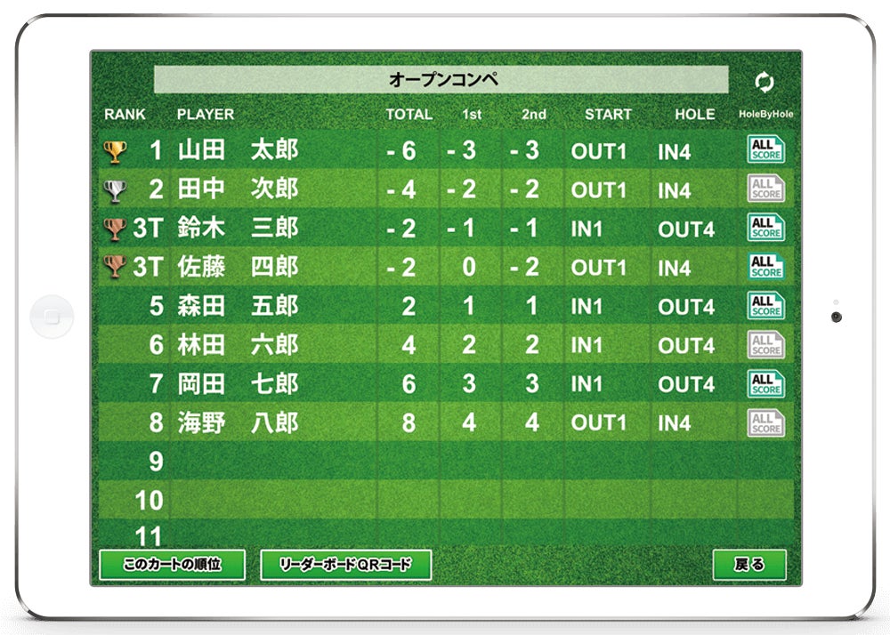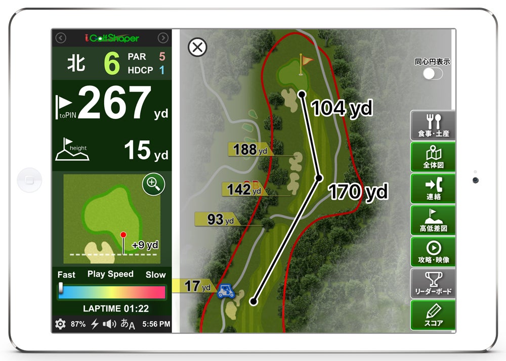 ナビゲーションシステム(アイシグリーンシステム株式会社:iGolfShaper)はiPadを利用した操作性・デザイン性に優れたシステムです。また、グループでのラウンドやコンペの際には、リーダーズボードが活用でき、音声ガイダンスでプレーを盛りあげてくれる機能付きで、いつものゴルフに一層の楽しみが広がります。