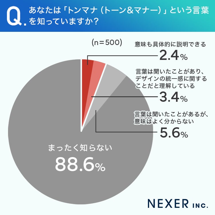 一方で「言葉は聞いたことがあるが意味はよく分からない」が5.6%、「言葉は聞いたことがあり、デザインの統一感に関するものだと理解している」が3.4%、「意味も具体的に説明できる」と答えた人はわずか2.4%でした。