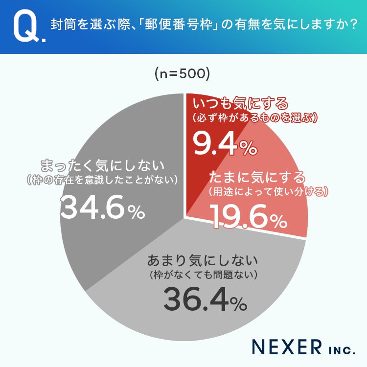 一方で「たまに気にする(用途によって使い分ける)」は19.6%、「いつも気にする(必ず枠があるものを選ぶ)」は9.4%でした。封筒選びにおいて郵便番号枠を意識する人は、全体の約3割にとどまっています。