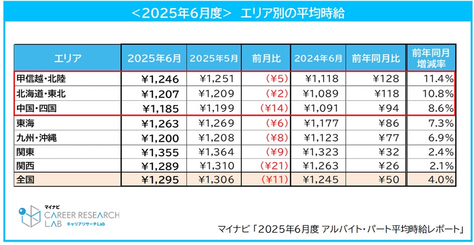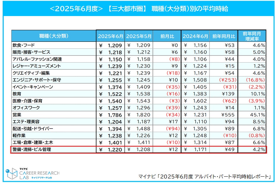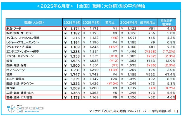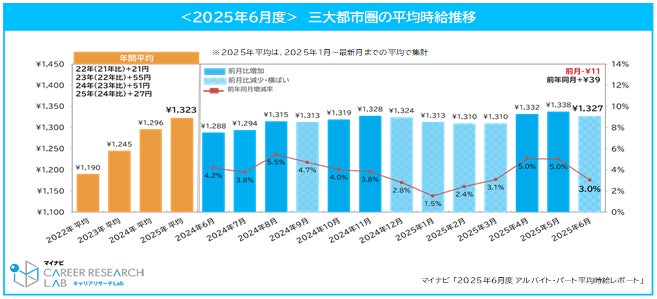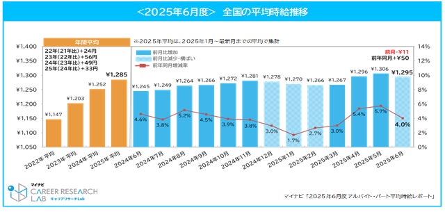 マイナビ、「2025年6月度アルバイト・パート平均時給レポート」を発表