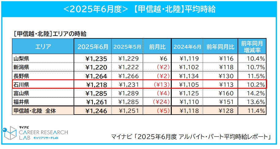 令和6年能登半島地震から1年半が経過した「石川県」の平均時給は1,218円で、甲信越・北陸エリアで最も低かった。