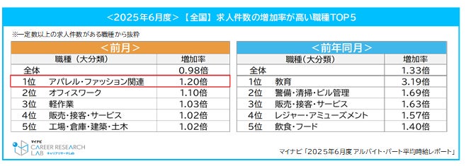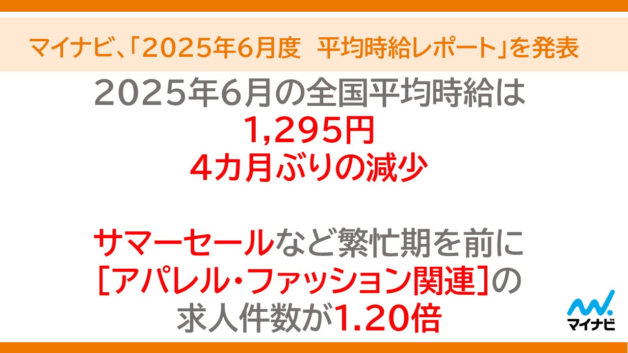 ◆2025年6月の全国平均時給は1,295円で、4カ月ぶりの減少。サマーセールなど繁忙期を控える[アパレル・ファッション関連]の求人件数が1.20倍と大幅増