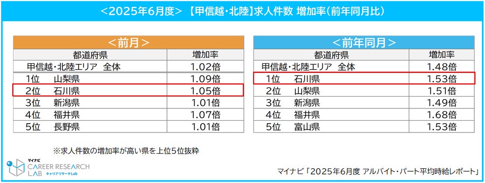 ◆【今月の都道府県TOPIC】令和6年能登半島地震から1年半が経過した「石川県」に注目。「石川県」の平均時給は1,218円。求人件数の前年同月比1.53倍とエリア内で最も増加