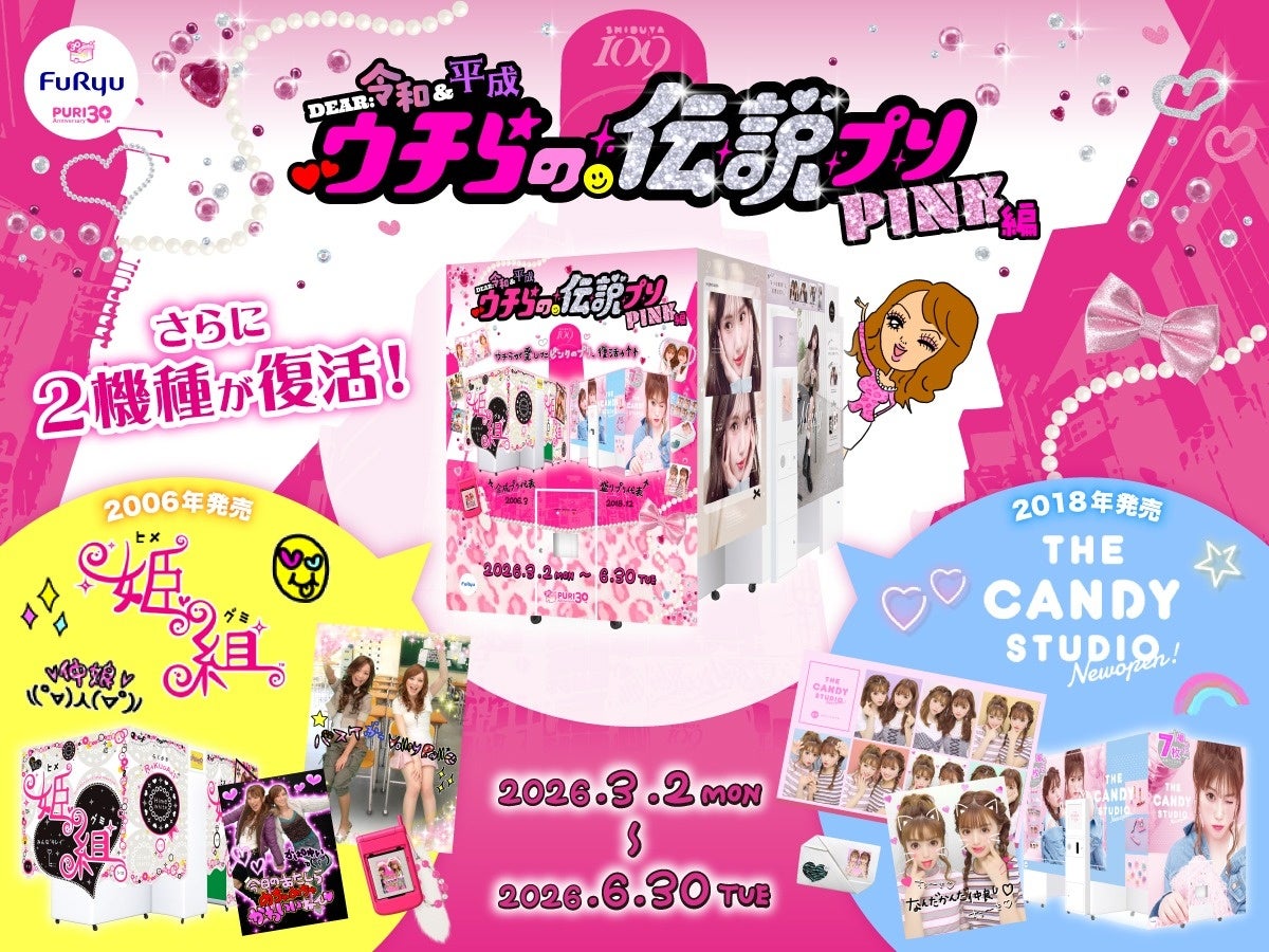 フリュー株式会社(本社:東京都渋谷区、代表取締役社長:榎本雅仁、以下フリュー)は、プリントシール(以下、プリ)機30周年を記念して、この30年間の歴史の中でプリを体験してくださった方の記憶に深く刻まれている“伝説のプリ機”が楽しめる特別復活企画の第2弾「DEAR 令和&平成 ウチらの伝説プリ PINK編(以下 、PINK編)」を、3月2日(月)から6月30日(火)までプリ機『Meidy(メイディー)』にて実施いたします。また、第1弾も6月30日(火)まで実施中です。