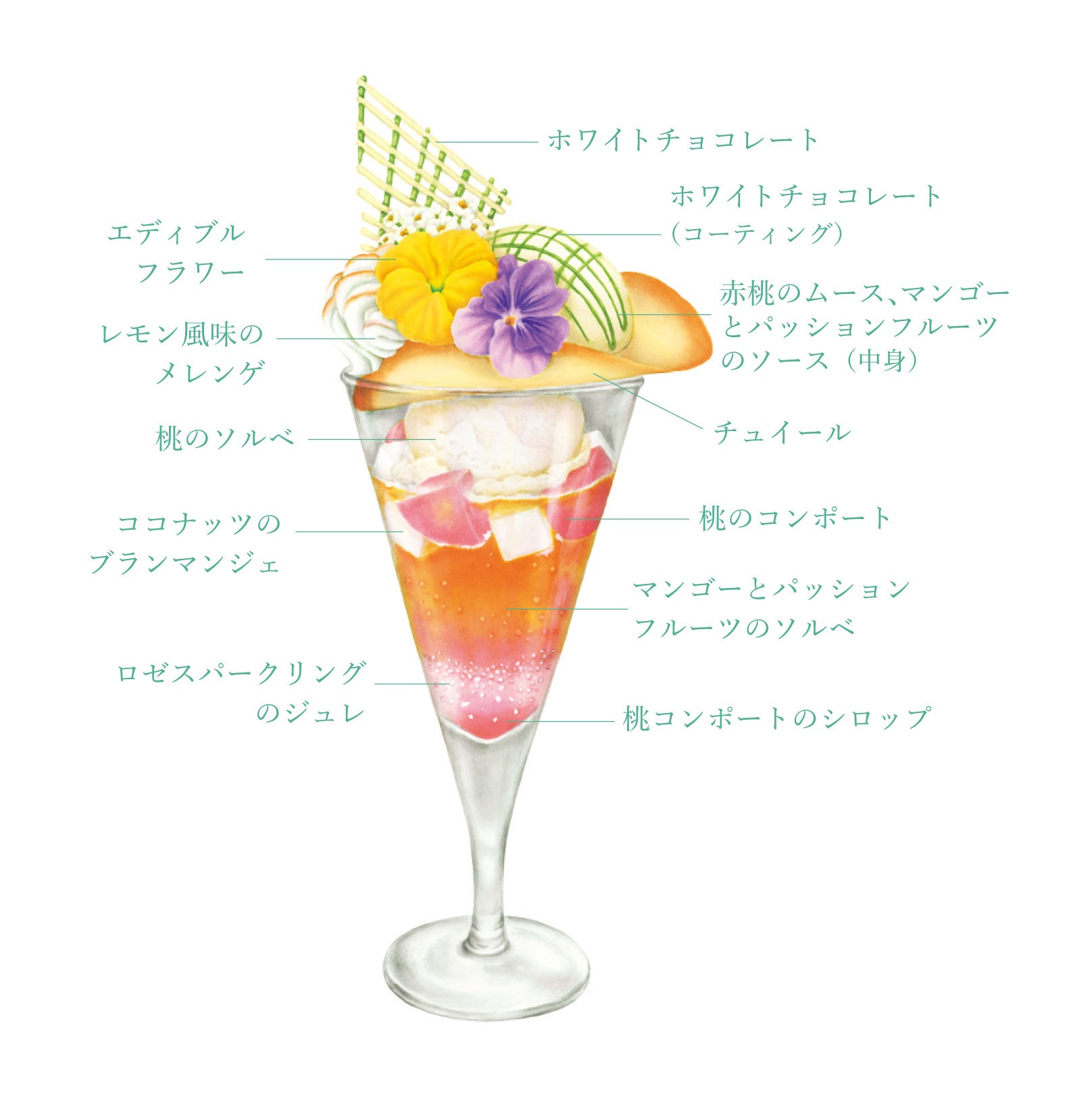 ウェブ花椿の連載企画『ユリ キュンカード』の花言葉シリーズ。2022年8月のテーマ「ひまわり」をイメージして資生堂パーラーの飲料長が創作したのは、旬を迎えた甘くみずみずしい桃の魅力を様々なバリエーションで楽しめるまさに“桃のとりこ”になる一品。麦わら帽子に見立てたトップのデコレーションは、プレートに移して召し上がっていただくセパレートタイプのパフェ。麦わら帽子を模したチュイール(薄いサクサクしたクッキー生地)の上に乗るホワイトチョコレートの中には赤桃のムース、ナイフを入れた瞬間に太陽の恵みを感じる濃厚なマンゴーとパッションフルーツのソースがあふれ出てきます。パフェグラスの中は桃のソルベ、桃のコンポート、ココナッツのブランマンジェ、マンゴーとパッションフルーツのソルベ、ロゼスパークリングのジュレなどが織りなす、夏の午後のリッチなティータイムにふさわしい贅沢な味わいのパフェに仕上げました。