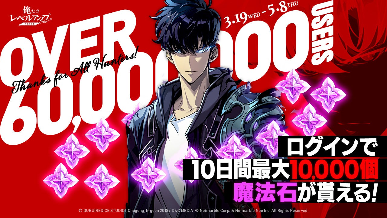 『俺だけレベルアップな件:ARISE』は、世界中のユーザーさまのご声援の元でグローバルダウンロード数6,000万を達成いたしました。心より感謝申し上げます。