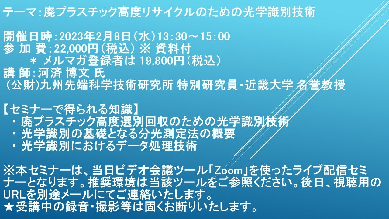 先端技術情報や市場情報を提供している(株)シーエムシー・リサーチ(千代田区神田錦町: https://cmcre.com/ )では、 各種材料・化学品などの市場動向・技術動向のセミナーや書籍発行を行っておりますが、 このたび「廃プラスチック高度リサイクルのための光学識別技術」と題するセミナーを、 講師に河済 博文 氏 (公財)九州先端科学技術研究所 特別研究員・近畿大学 名誉教授)をお迎えし、2023年2月8日(水)13:30より、 ZOOMを利用したライブ配信で開催いたします。 受講料は、 一般:22,000円(税込)、 弊社メルマガ会員:19,800円(税込)(資料付)となります。