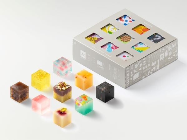 大阪の魅力を表現しながら、菓子職人としての技術を見せ合う様を万博内の「パビリオン」に見立てた、キューブ型のひとくちようかんです。関西のお菓子屋9店舗+高校生がそれぞれのプロデューサーとなり、18種類の“予感”にあふれるようかんを共創しました。(セットは5種)(今回の大丸梅田店での販売には6店舗が参加しています)