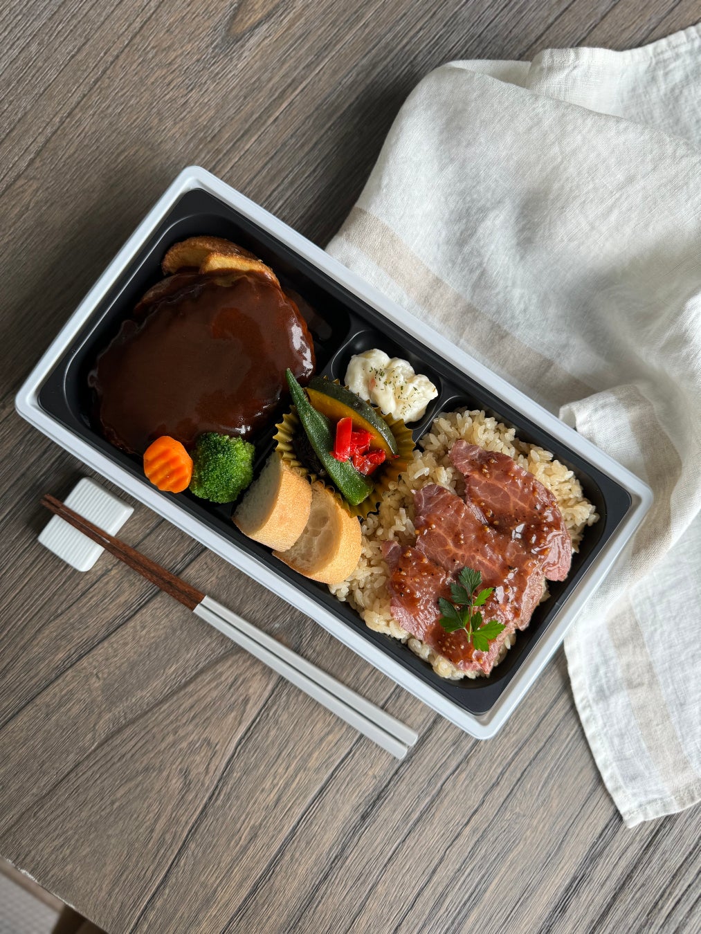 脂が少なくさっぱりとした味わいの牛サガリをガーリックライスの上に乗せ、デミグラスハンバーグと合わせたスペシャルな洋食御膳です。