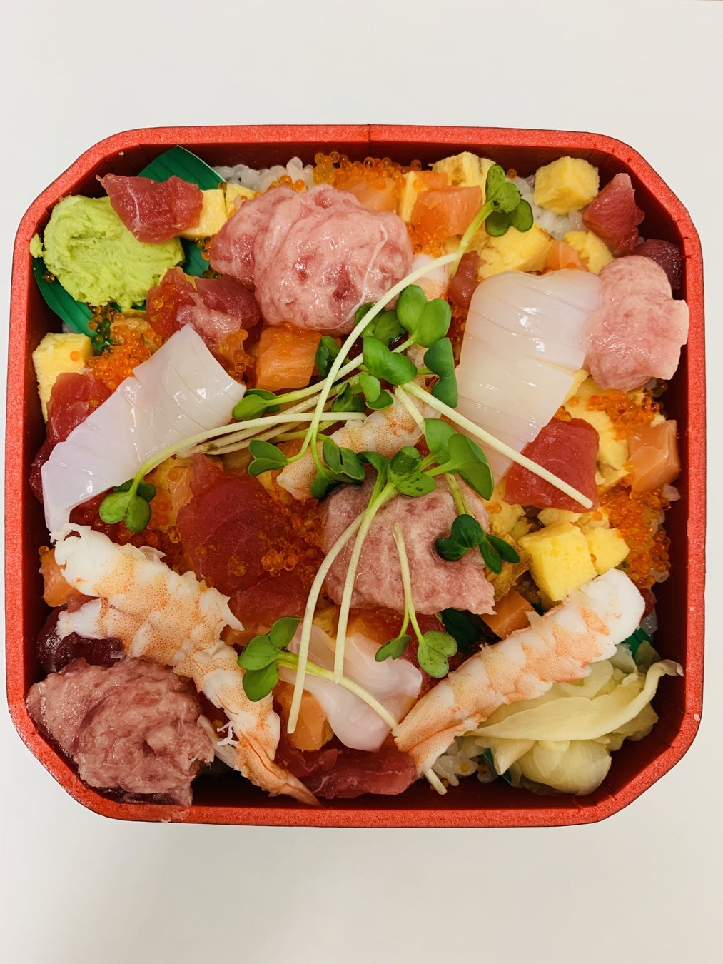 まぐろ、いか、サーモン、いくら、ししゃもっこ、ネギトロなど10種類のネタを使った具沢山ちらし。