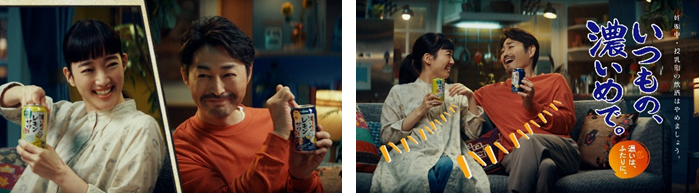 「サッポロ 濃いめのレモンサワー」を片手に「いつもの」と声をかける安田さん。それに対して入山さんは「サッポロ 濃いめのレモンサワー 若檸檬」を片手に「濃いめで」と応え、二人で勢いよく一口飲むシーンからスタートします。安田さんが「やっぱ濃いって、いいね」とつぶやくと、最近、二人の間に“恋”が足りないと感じている入山さんは「恋?」と反応。すると入山さんは漫画に切り替わり、「ずっと恋人のようにって、言ってたよね…」と、プロポーズの言葉を思い出し少し毒づきます。同じく漫画に切り替わった安田さんが「そっちの恋じゃないよ…」と困る様子を見せますが、最後は実写に戻った二人で仲良く乾杯し、笑い合い「濃い」と「恋」がすれ違う会話がコミカルに展開されています。