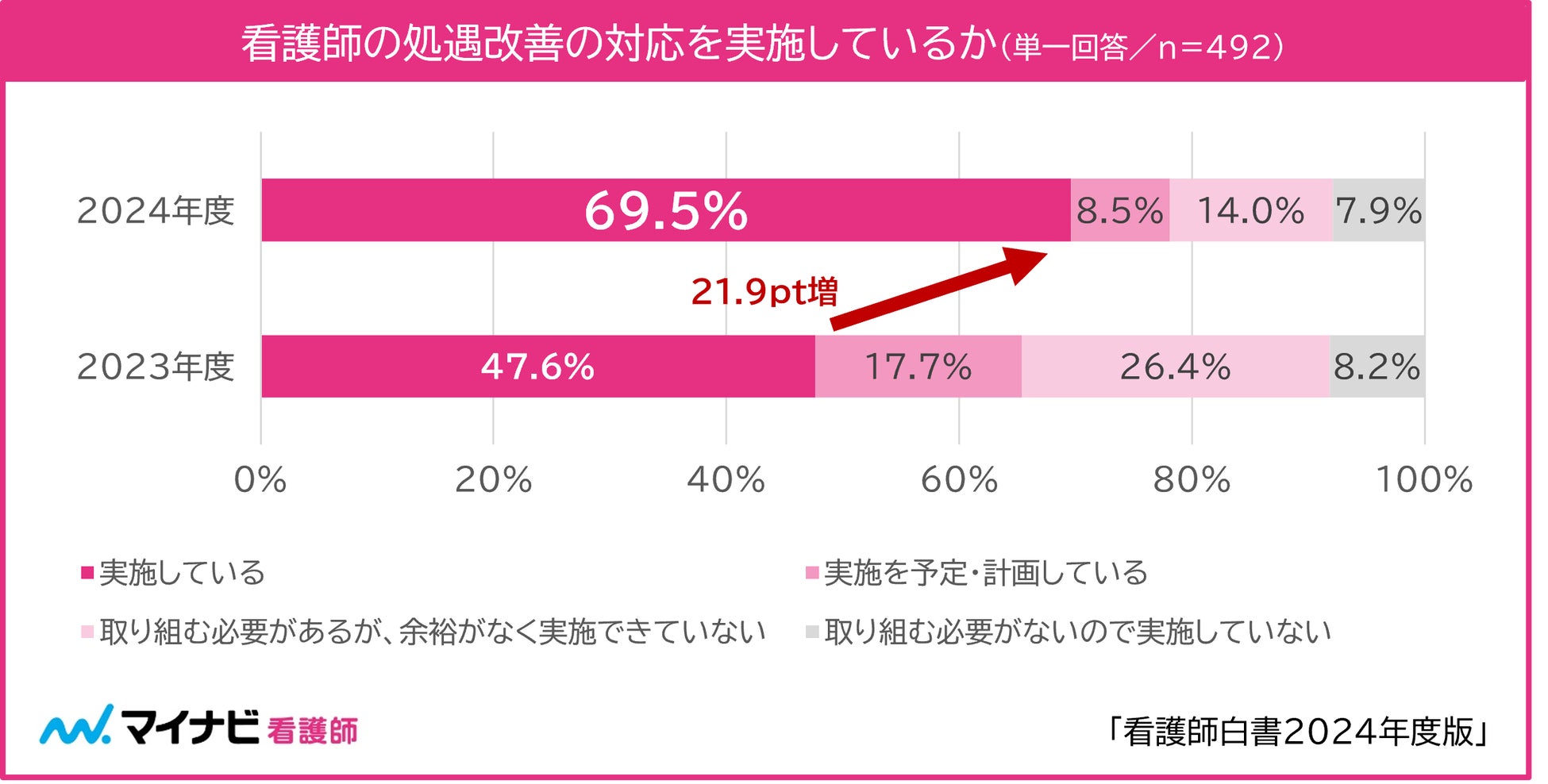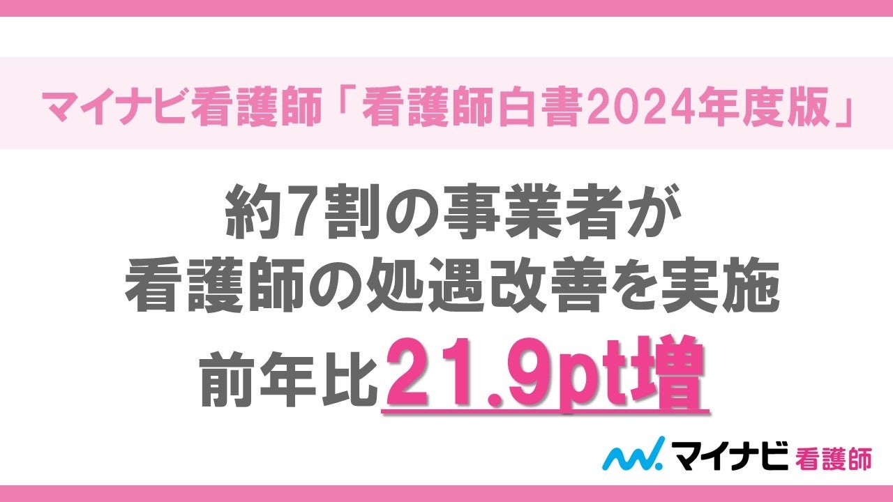 約7割の事業者が看護師の処遇改善を実施しており、前年比21.9pt増