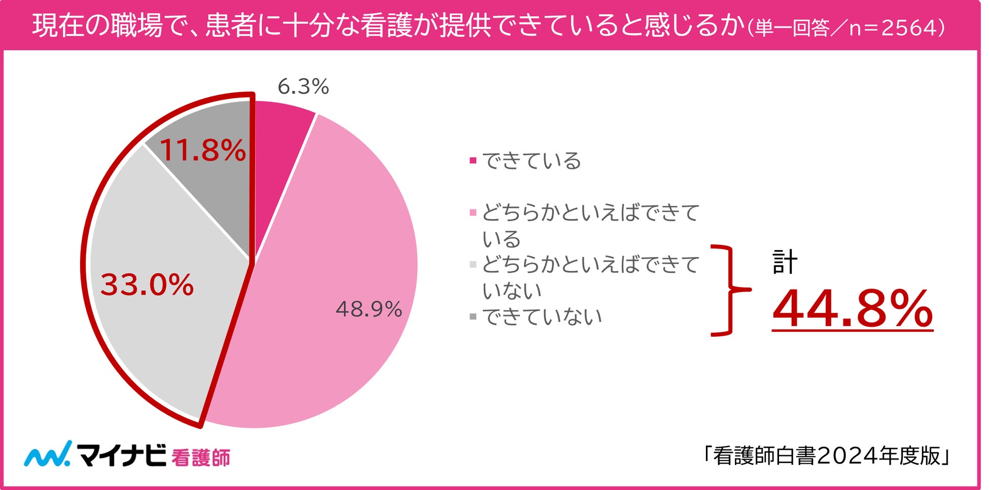 看護師に現在の職場で、患者に十分な看護が提供できていると感じるか聞くと、「どちらかといえばできている」が48.9%で最多だった。一方、「どちらかと言えばできていない(33.0%)」、「できていない(11.8%)」を合わせると4割超が十分な看護の提供ができていないと感じていることがわかった。