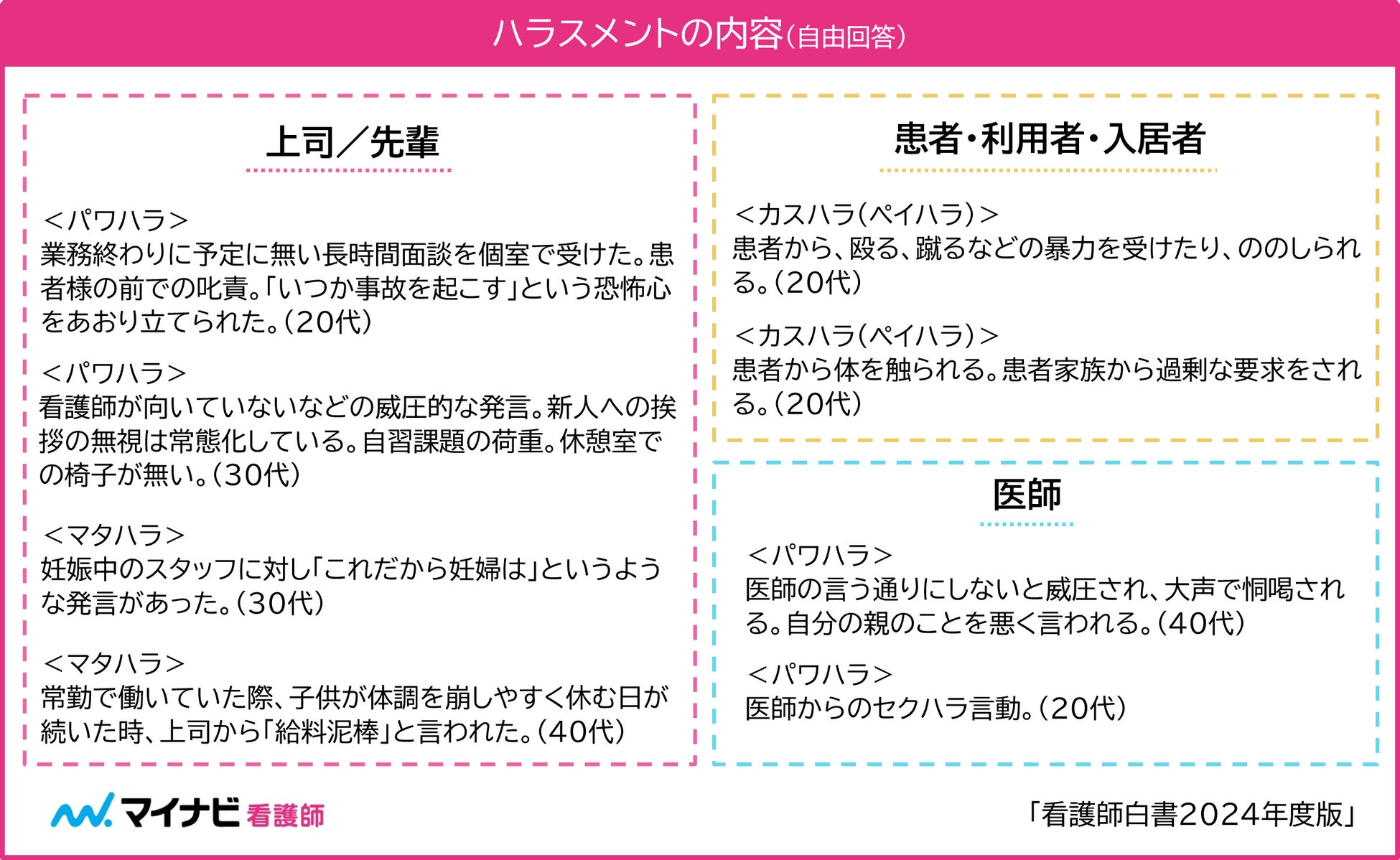 ハラスメントの内容を自由回答で聞くと「業務終わりに予定に無い長時間面談を個室で受けた。」や、「看護師が向いていないなどの威圧的な発言。新人への挨拶の無視の常態化」など、職場での立場を利用したパワハラや、「妊娠中のスタッフに対し“これだから妊婦は”というような発言があった。」など、女性の妊娠・出産・育児に対する「マタハラ」が多くあがった。