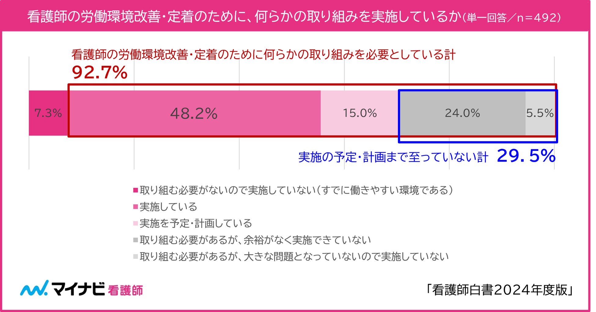9割を超える事業者が看護師の労働環境改善・定着のための取り組みを必要としているが、その約3分の1が取り組み実施の予定・計画に至っていない