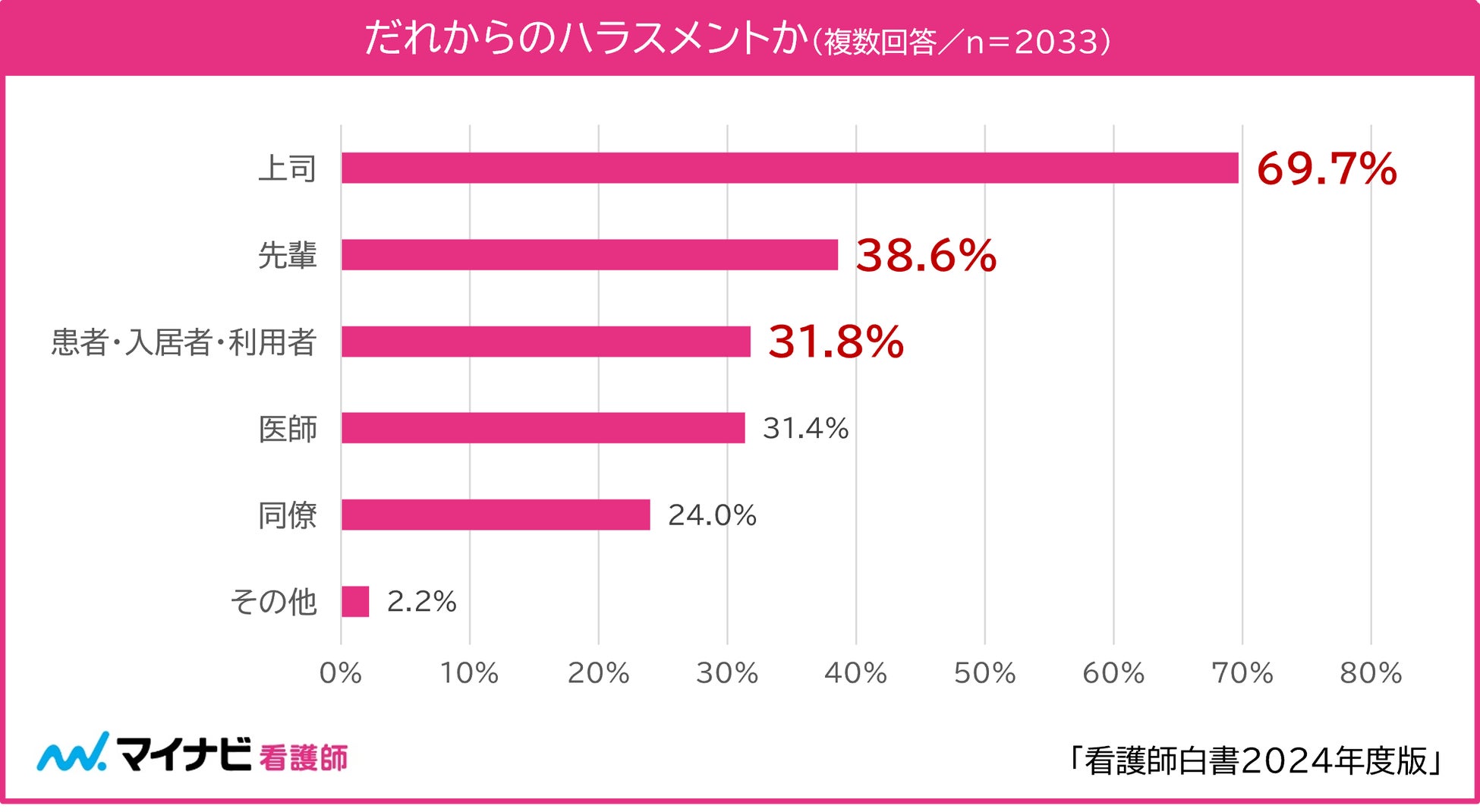 約8割の看護師がこれまでの職場でハラスメントを「受けたことがある」または「見たことがある」。「上司」からのハラスメントが最多で69.7%