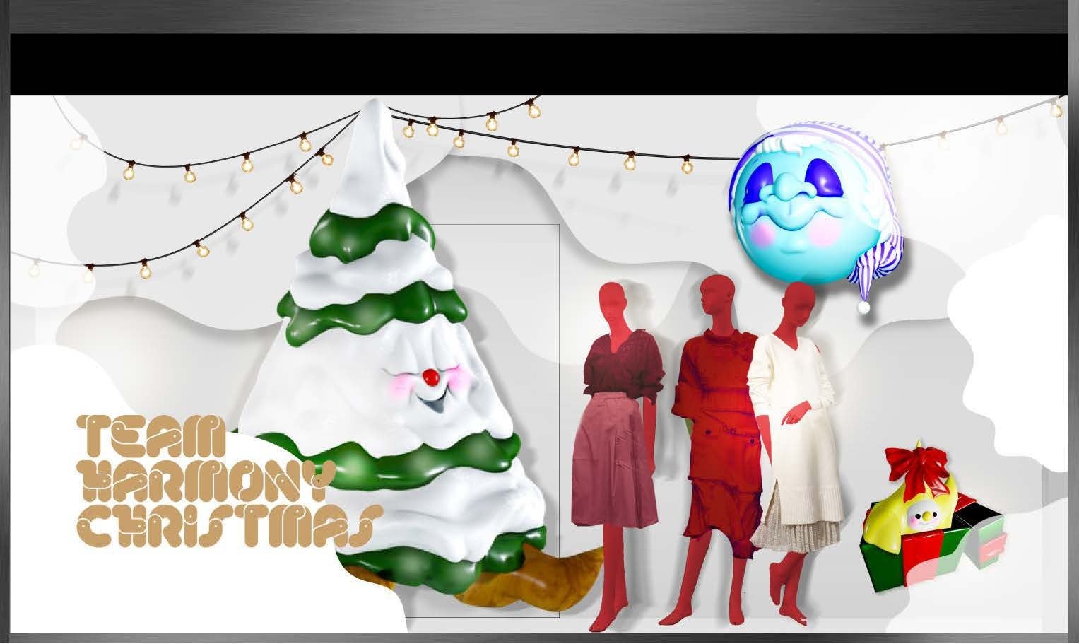 年間のシーズン広告とクリスマス広告のクリエイティブディレクションを務めたJamie Reid Studioによりデザインされたツリーやウィンドウの演出プラン。白い雪の世界の様々なキャラクターたちが、パルコのクリスマス演出に登場します。