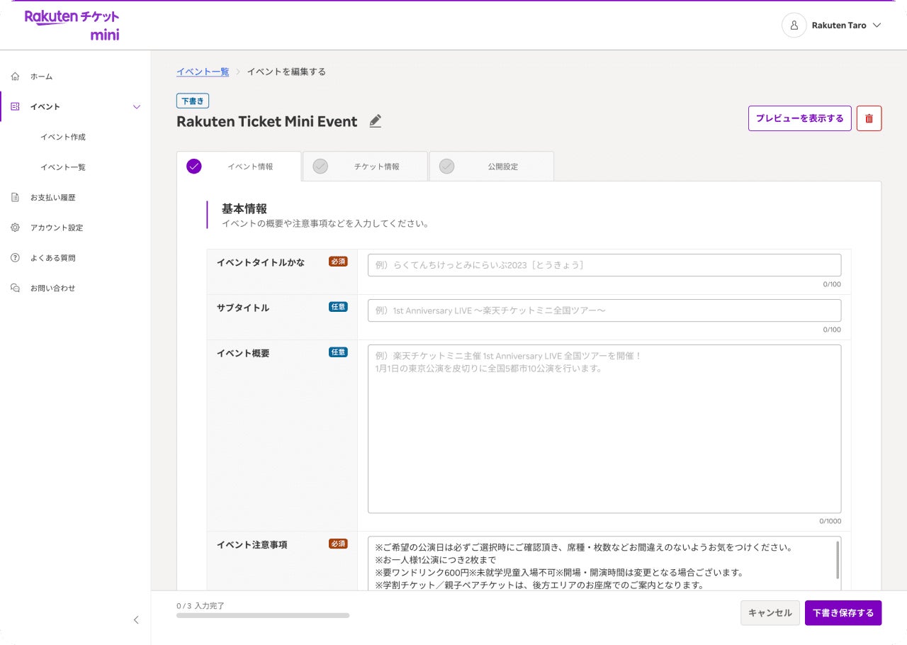 「楽天チケットmini」は、「楽天チケット」において、イベント主催者がチケットの販売管理から売り上げ管理、入場管理までを実施できる「セルフオンボーディング」方式を採用したシステムで、イベントを主催する法人が利用可能です(注2)。イベント主催者はイベント概要とチケット情報、「楽天チケット」ウェブサイト上に掲載するイベントページの公開日を登録するだけで、直後から、「楽天チケット」でチケットの販売を開始することができます(注3)。