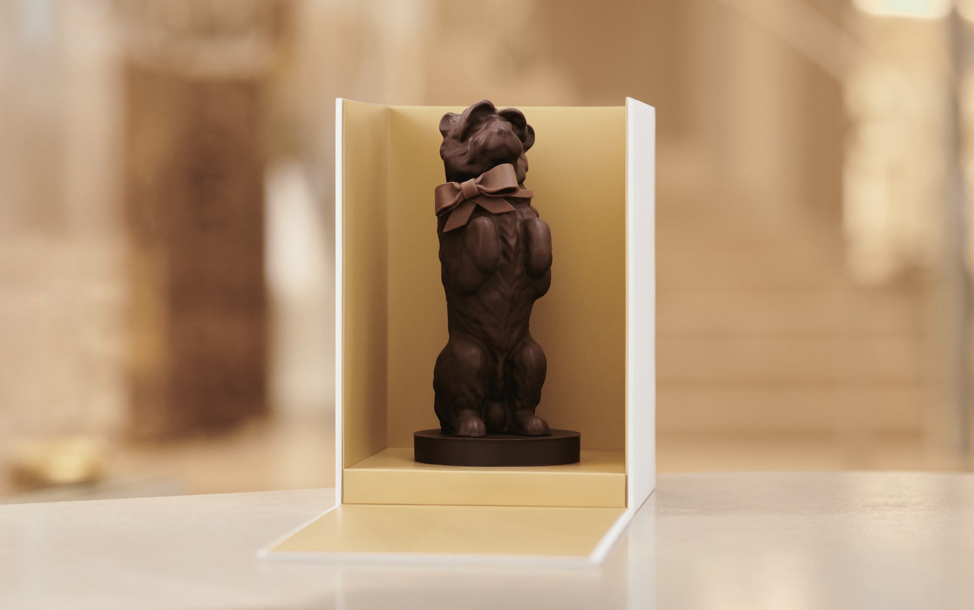 自らを「美食家」と称したクリスチャン・ディオールが培ってきた「アート ドゥ ヴィーヴル」へのテイストを称え、メゾンはイースターに向け、シェフのジャン・アンベールと彼のコラボレーター、ロミュアルド・ビザールが考案した新作チョコレートを発表します。ディオールの魅惑的な伝統へのオマージュのように、この特別な作品は精巧な彫刻として、創設者クチュリエの愛犬「ボビー」の形をとりました。愛犬「ボビー」はメゾンが象徴とするコードとなるまで、多くのモデルにその名を与えました。「毎シーズン、成功を期待して『ボビー』と呼ぶスーツがありました」と、ムッシュ ディオールは回想録で打ち明けています。ダークチョコレートの濃厚さとプラリネをふんだんに使ったベースの繊細さが見事に融合したこの芸術作品は、それ自体が抗いがたい力強さと美味しい香りを放っています。究極のサプライズとして、精巧に作られたミルクチョコレートのリボンが喜びを完成させます。魅惑のひとときを約束する洗練されたスイーツは、4月7日よりパリの本店「30 モンテーニュ」内にある「ラ パティスリー ディオール」にてご覧いただけます。
