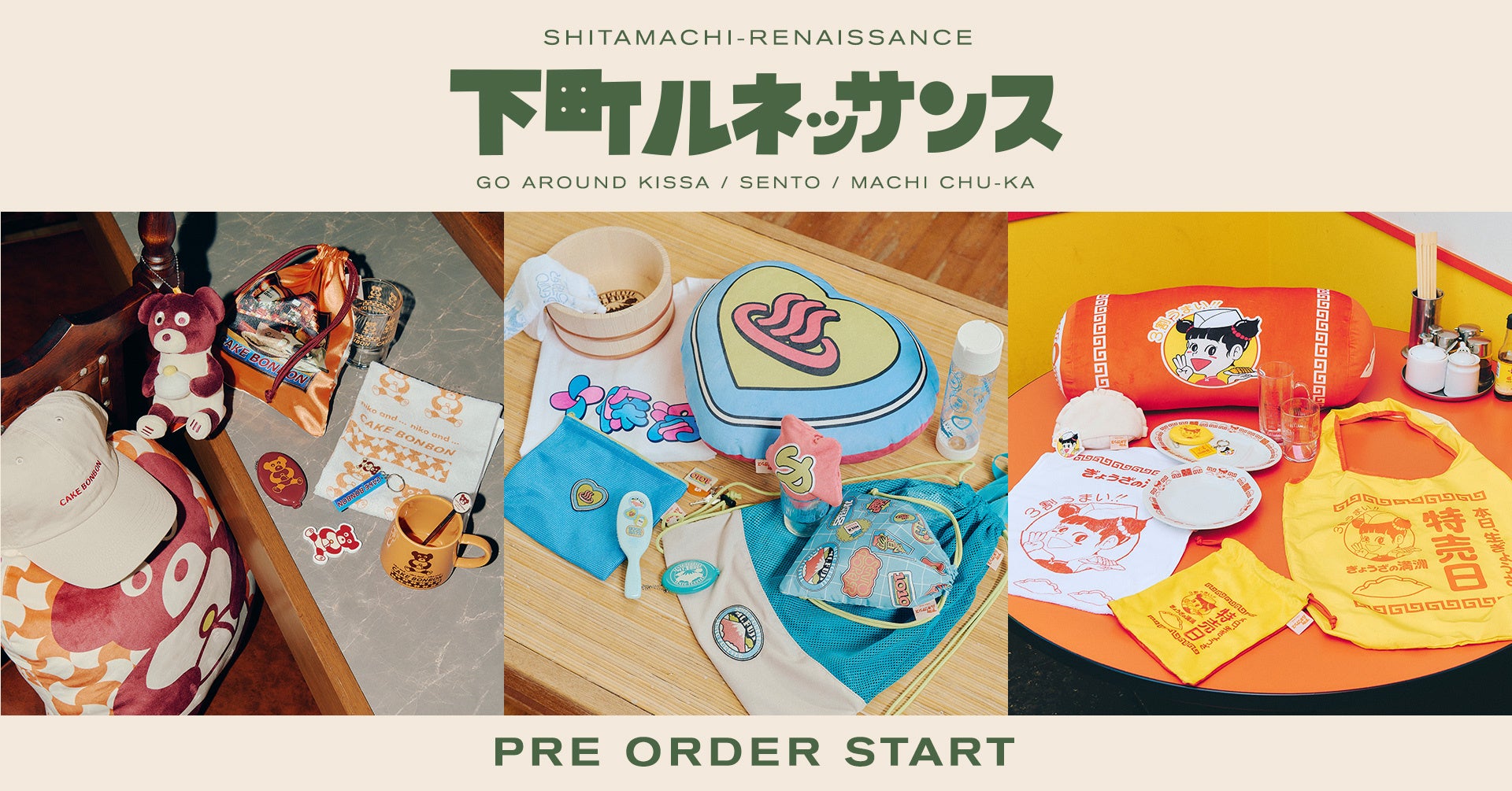 純喫茶のコラボレーションは、名古屋を代表する「洋菓子・喫茶 ボンボン」との、ノスタルジックな雰囲気が漂うフォトTシャツや雑貨を展開します。銭湯は「SENTO FOREVER」や「十條湯」、さらに「銭湯を日本から消さない」をモットーに掲げている「ゆとなみ社」が継業した京都・五条にある「サウナの梅湯」や神戸・湊川の「湊河湯」との別注アパレルを販売します。町中華からは「3割うまい!!」というキャッチコピーで知られる「ぎょうざの満洲」とのコラボ雑貨を中心に展開し、下町の1日を楽しんでいただけるユニークな限定アイテムを展開します。