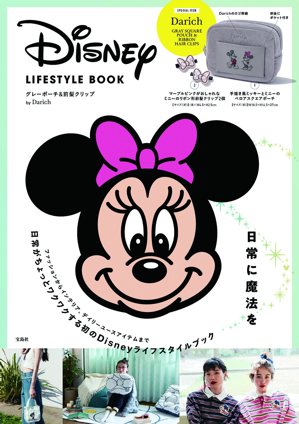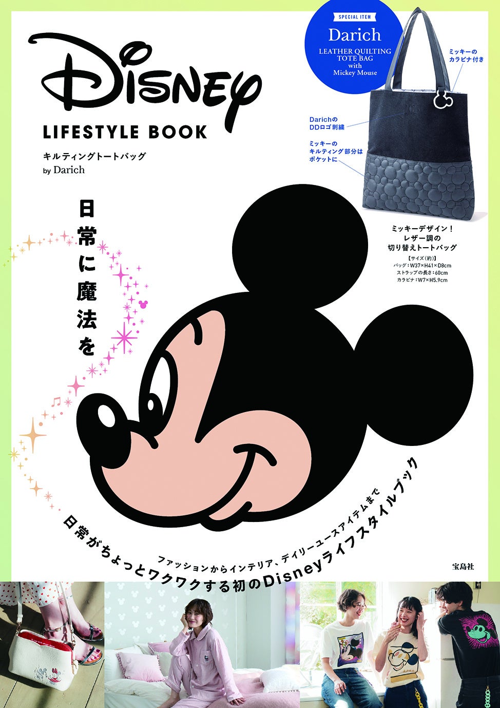 本誌は、ウォルト・ディズニー・ジャパン株式会社(以下、ディズニー)の新ライフスタイルコンセプト『日常に魔法を』をテーマに、最新のミッキーマウスのアイテム約50ブランド・230商品の紹介をした初のライフスタイルブックです。スペシャルアイテムは、人気ファッションプロデューサー齊藤早紀さんがプロデュースするアパレルブランド「Darich(ダーリッチ)」より、トートバッグやポーチなど全4種のバリエーション豊かなアイテムです。