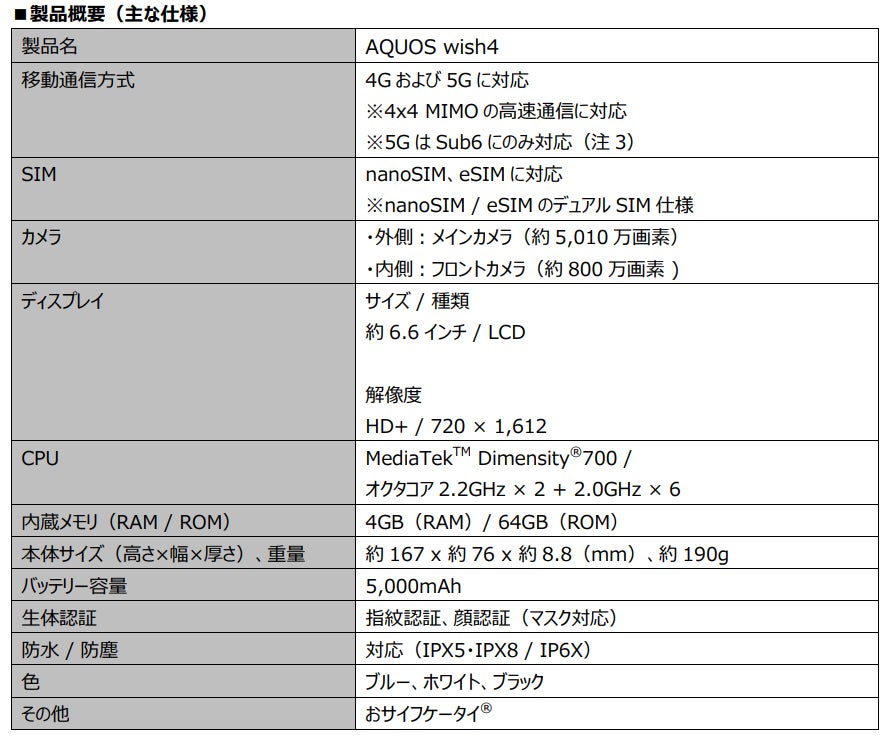 楽天モバイル株式会社(以下「楽天モバイル」)は、「楽天モバイル」公式サイトにて、本日7月18日(木)午前10時より「AQUOS wish4」の予約受付を開始し、「楽天モバイル」公式サイト、「楽天モバイルショップ」および「楽天モバイル公式 楽天市場店」にて、7月29日(月)午前9時より31,900円(税込)で発売します(注1、2)。本製品は、丸みを帯びた優しいフォルムで割れにくい丈夫な大画面と大容量のバッテリーを搭載した5G対応スマートフォンです(注3)。実施中のキャンペーンをご利用いただくと、他社から番号そのままのお乗り換えで「Rakuten最強プラン」を初めてお申し込みいただいたお客様を対象に、12,000ポイントの「楽天ポイント」を還元します(注4、5)。