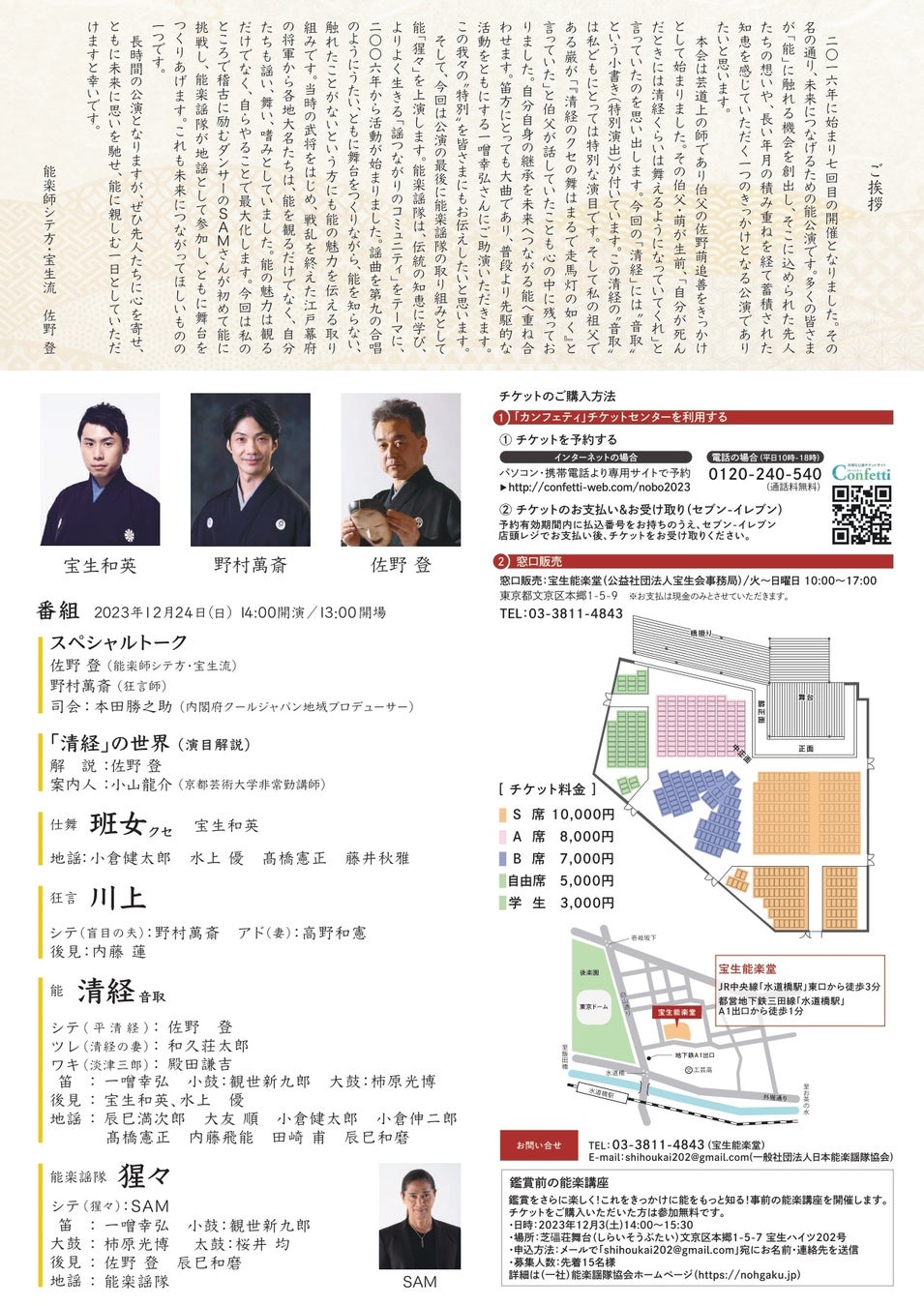 本会は芸道上の師であり伯父の佐野萌追善をきっかけとして始まりました。その伯父・萌が生前、「自分が死んだときには清経くらいは舞えるようになっていてくれ」と言っていたのを思い出します。今回の「清経」には“音取”という小書き(特別演出)が付いています。この清経の“音取”は私どもにとっては特別な演目です。そして私の祖父である巌が「『清経のクセの舞はまるで走馬灯の如く』と言っていた」と伯父が話していたことも心の中に残っておりました。自分自身の継承を未来へつながる能へ重ね合わせます。笛方にとっても大曲であり、普段より先駆的な活動をともにする一噌幸弘さんにご助演いただきます。この我々の“特別”を皆さまにもお伝えしたいと思います。