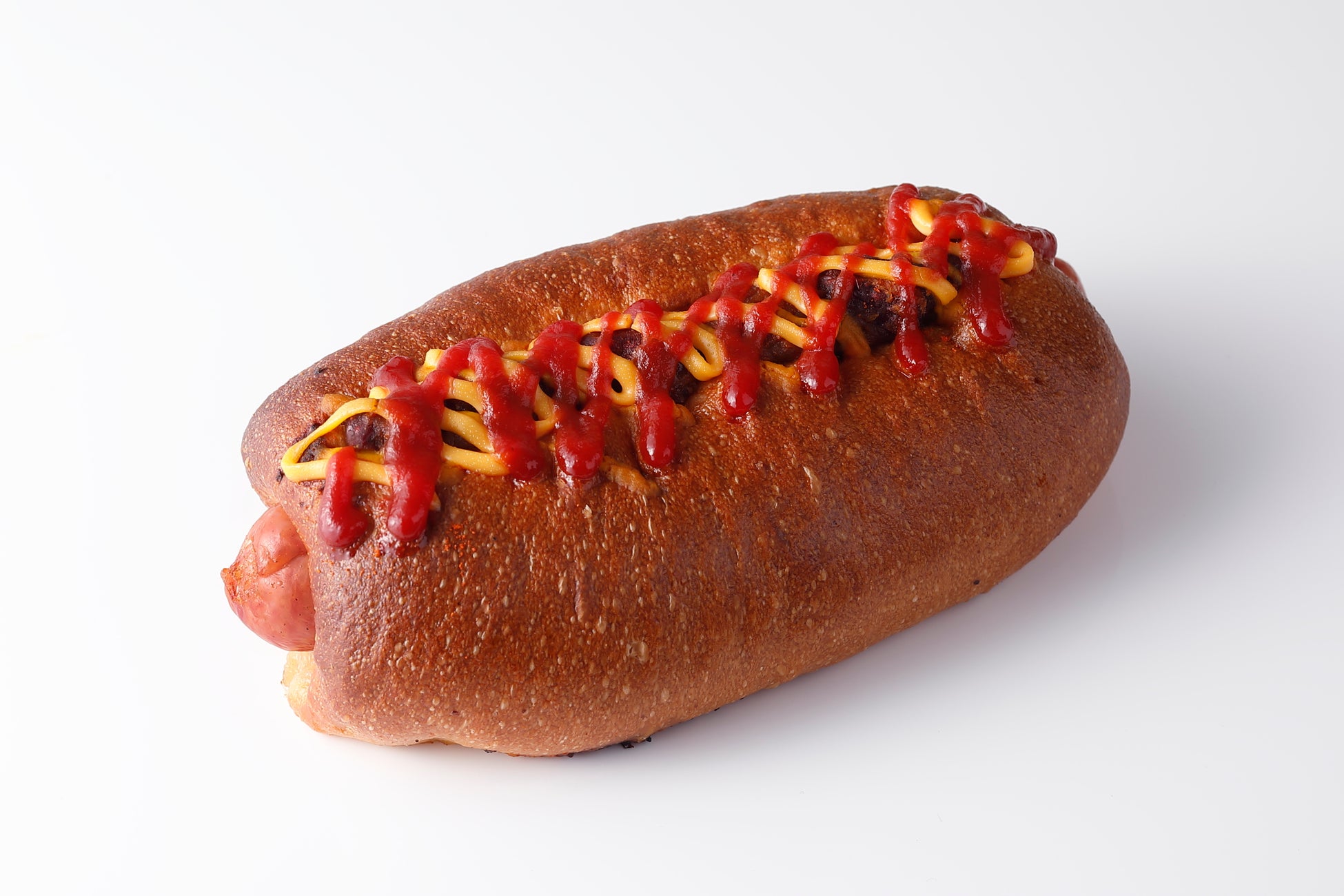 スーパーフードとしても名高いコーヒー果皮「カスカラ」入りのブレッドに、粗挽きフランクを挟んだ食べ応えのあるホットドッグ。たくあんやチリコンカンが味のアクセントに。