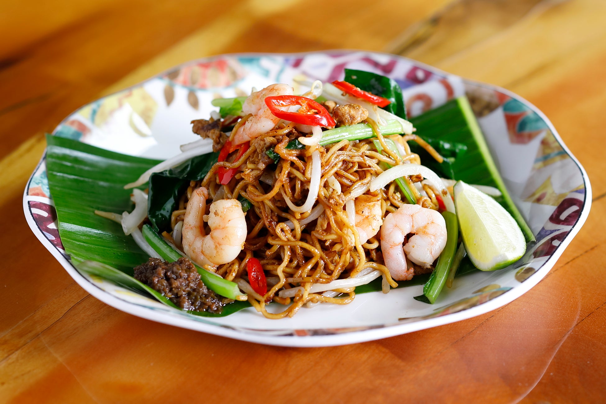 香ばしい海老と青唐辛子の旨辛なペーストで炒めたマレー風スパイシー焼きそば。お花見の席にぴったりの色彩豊かな一品です。