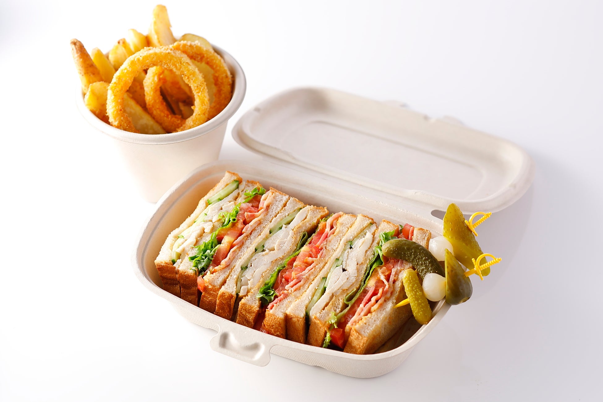 お花見の席やピクニックなど屋外でのお食事の代表「サンドウィッチ」。ローストチキンやベーコン、トマトやきゅうりなどを使用したクラシックスタイルのアメリカンクラブハウスサンドウィッチをご用意しました。※フライドポテト・オニオンリング付き