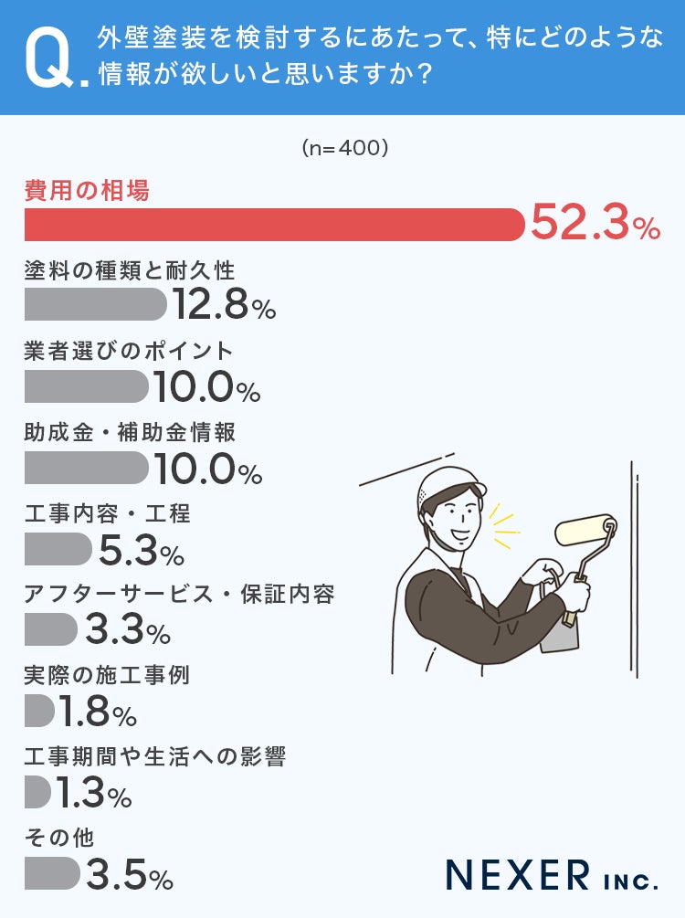 その結果、最も多かったのは「費用の相場」で52.3%と半数を超えました。次いで「塗料の種類と耐久性」が12.8%、「業者選びのポイント」と「助成金・補助金情報」がそれぞれ10%となっています。