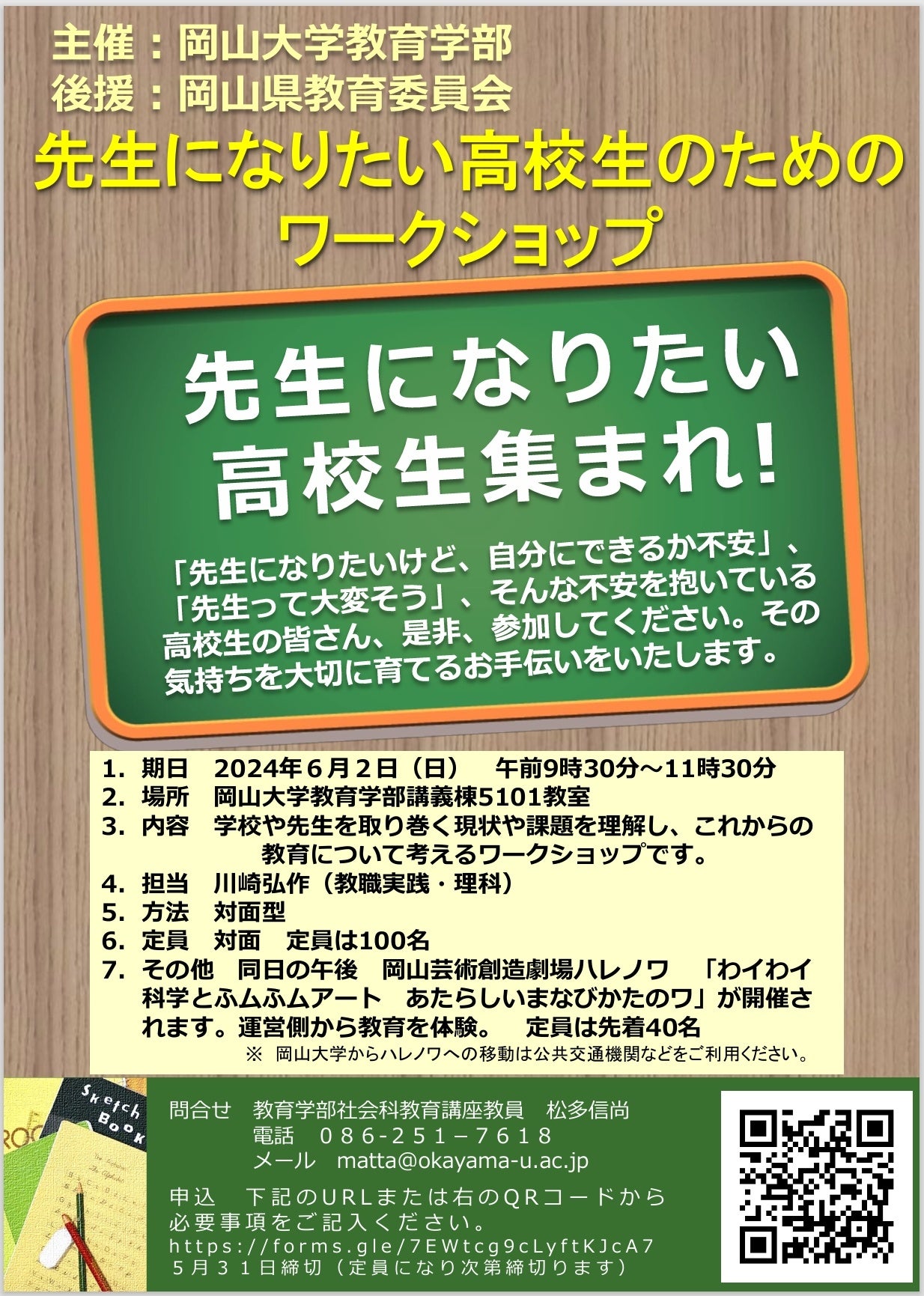 国立大学法人岡山大学(本部:岡山市北区、学長:那須保友)の大学院教育学研究科・教育学部では、第1回先生になりたい高校生のためのワークショップを、2024年6月2日(日)9:30〜11:30に本学津島キャンパスの教育学部講義棟5101教室で開催します。