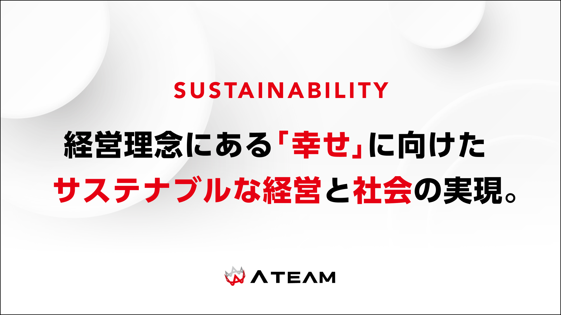 経営理念の「みんなで幸せになれる会社にすること」「今から100年続く会社にすること」にある「幸せ」の実現に向けたサステナブルな経営と社会の実現のため、エイチームはサステナビリティを推進してまいります。